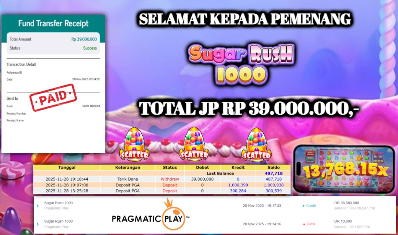 Selamat kepada User id : SUR****** Telah berhasil mendapatkan kemenangan besar pada permainan SLOT SUGAR RUSH 1000 dengan total kemenangan Sebesar Rp 39.000.000,- Setelah mengisi formulir withdraw dengan kurung waktu hanya 5 – 10 menit pihak BESTTOGEL sudah melakukan transfer kepada pemilik Userid dan dana sudah dapat di cairkan oleh pemenang. Bukti pembayaran yang kami berikan merupakan bukti pembayaran yang SAH / VALID yang langung di dapatkan melaui tanda transfer transaksi dari Bank yang di tuju.
