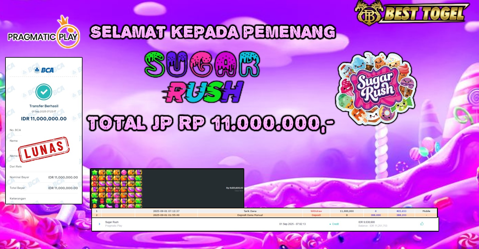 BUKTI JACKPOT SLOT SUGAR RUSH Rp. 11.000.000,00- LUNAS