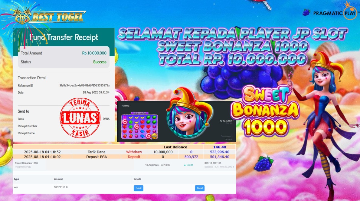 kepada User id : BDK***** Telah berhasil mendapatkan kemenangan besar pada permainan SLOT SWEET BONANZA 1000 dengan total kemenangan Sebesar Rp. 10.000.000,00- Setelah mengisi formulir withdraw dengan kurung waktu hanya 5 – 10 menit pihak BESTTOGEL sudah melakukan transfer kepada pemilik Userid dan dana sudah dapat di cairkan oleh pemenang. Bukti pembayaran yang kami berikan merupakan bukti pembayaran yang SAH / VALID yang langung di dapatkan melaui tanda transfer transaksi dari Bank yang di tuju.