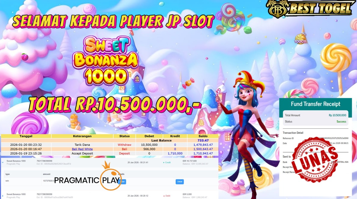 Selamat kepada User id : GLE****** Telah berhasil mendapatkan kemenangan besar pada permainan SLOT SWEET BONANZA 1000 dengan total kemenangan Sebesar Rp.10.500.000,– Setelah mengisi formulir withdraw dengan kurung waktu hanya 5 – 10 menit pihak BESTTOGEL sudah melakukan transfer kepada pemilik Userid dan dana sudah dapat di cairkan oleh pemenang. Bukti pembayaran yang kami berikan merupakan bukti pembayaran yang SAH / VALID yang langung di dapatkan melaui tanda transfer transaksi dari Bank yang di tuju.