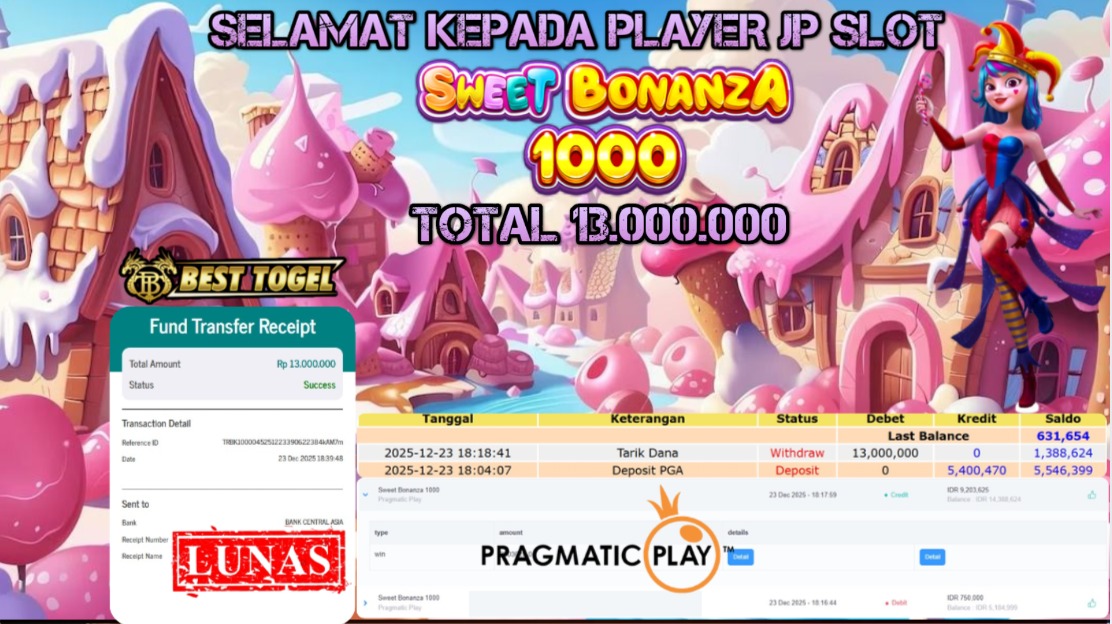 Selamat kepada User id : TRO9****** Telah berhasil mendapatkan kemenangan besar pada permainan SLOT SWEET BONANZA 1000 dengan total kemenangan Sebesar Rp. 13.000.000,- Setelah mengisi formulir withdraw dengan kurung waktu hanya 5 – 10 menit pihak  BESTTOGEL sudah melakukan transfer kepada pemilik Userid dan dana sudah dapat di cairkan oleh pemenang. Bukti pembayaran yang kami berikan merupakan bukti pembayaran yang SAH / VALID yang langung di dapatkan melaui tanda transfer transaksi dari Bank yang di tuju.