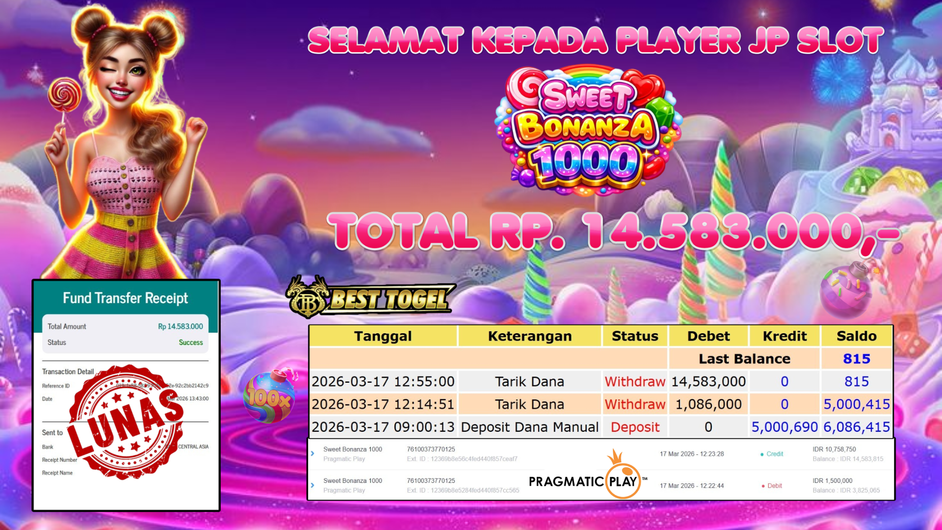 Selamat kepada User id : GEM****** Telah berhasil mendapatkan kemenangan besar pada permainan SLOT SWEET BONANZA 1000 dengan total kemenangan Sebesar Rp.14.583.000,– Setelah mengisi formulir withdraw dengan kurung waktu hanya 5 – 10 menit pihak BESTTOGEL sudah melakukan transfer kepada pemilik Userid dan dana sudah dapat di cairkan oleh pemenang. Bukti pembayaran yang kami berikan merupakan bukti pembayaran yang SAH / VALID yang langung di dapatkan melaui tanda transfer transaksi dari Bank yang di tuju.