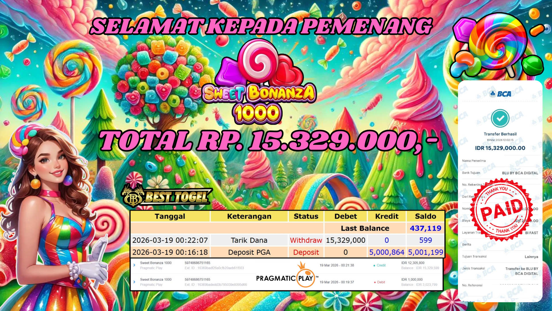 Selamat kepada User id : GMY****** Telah berhasil mendapatkan kemenangan besar pada permainan SLOT SWEET BONANZA 1000 dengan total kemenangan Sebesar Rp.15.329.000,– Setelah mengisi formulir withdraw dengan kurung waktu hanya 5 – 10 menit pihak  BESTTOGEL sudah melakukan transfer kepada pemilik Userid dan dana sudah dapat di cairkan oleh pemenang. Bukti pembayaran yang kami berikan merupakan bukti pembayaran yang SAH / VALID yang langung di dapatkan melaui tanda transfer transaksi dari Bank yang di tuju.