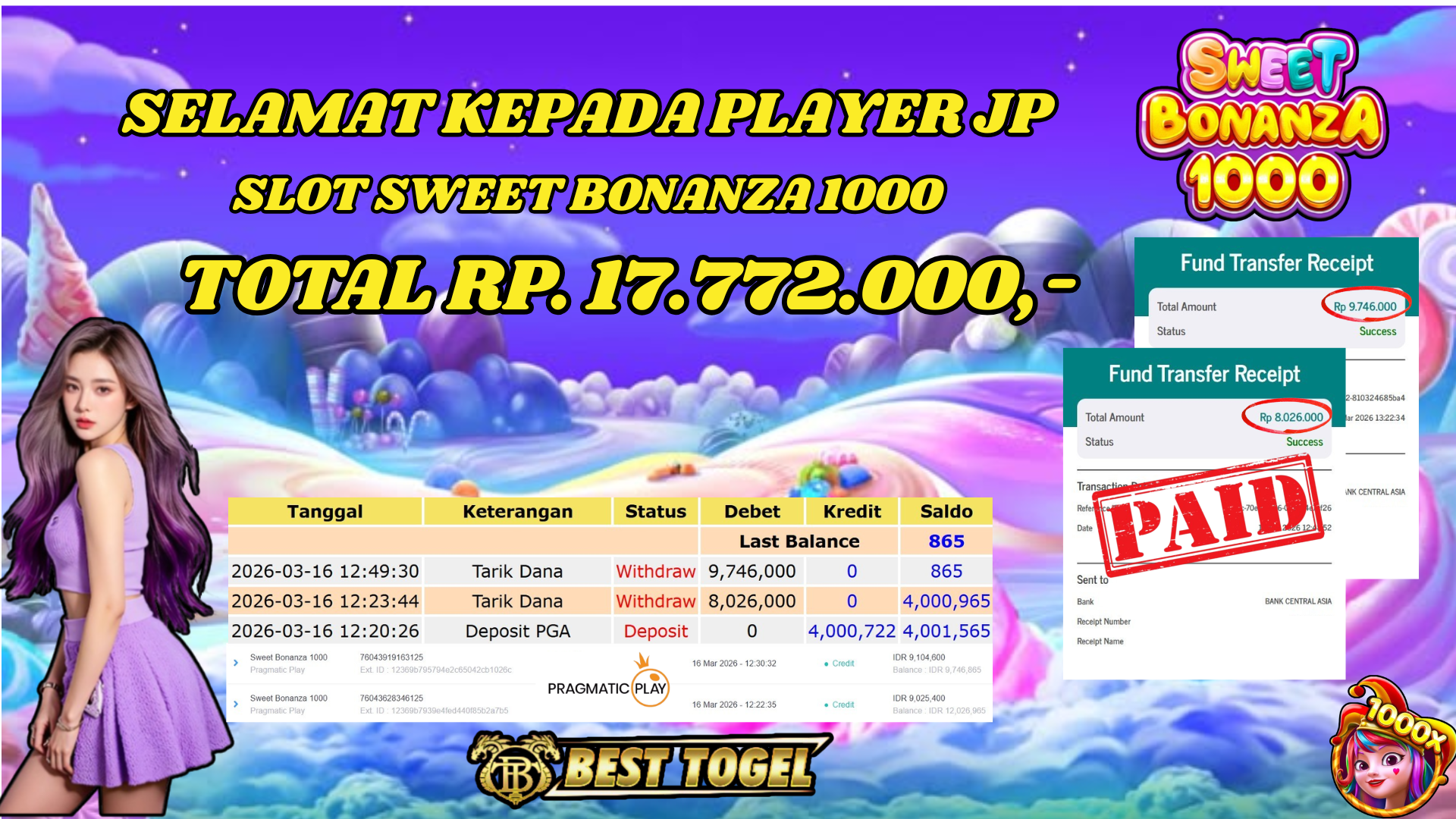Selamat kepada User id : BND****** Telah berhasil mendapatkan kemenangan besar pada permainan SLOT SWEET BONANZA 1000 dengan total kemenangan Sebesar Rp.17.772.000,– Setelah mengisi formulir withdraw dengan kurung waktu hanya 5 – 10 menit pihak  BESTTOGEL sudah melakukan transfer kepada pemilik Userid dan dana sudah dapat di cairkan oleh pemenang. Bukti pembayaran yang kami berikan merupakan bukti pembayaran yang SAH / VALID yang langung di dapatkan melaui tanda transfer transaksi dari Bank yang di tuju.