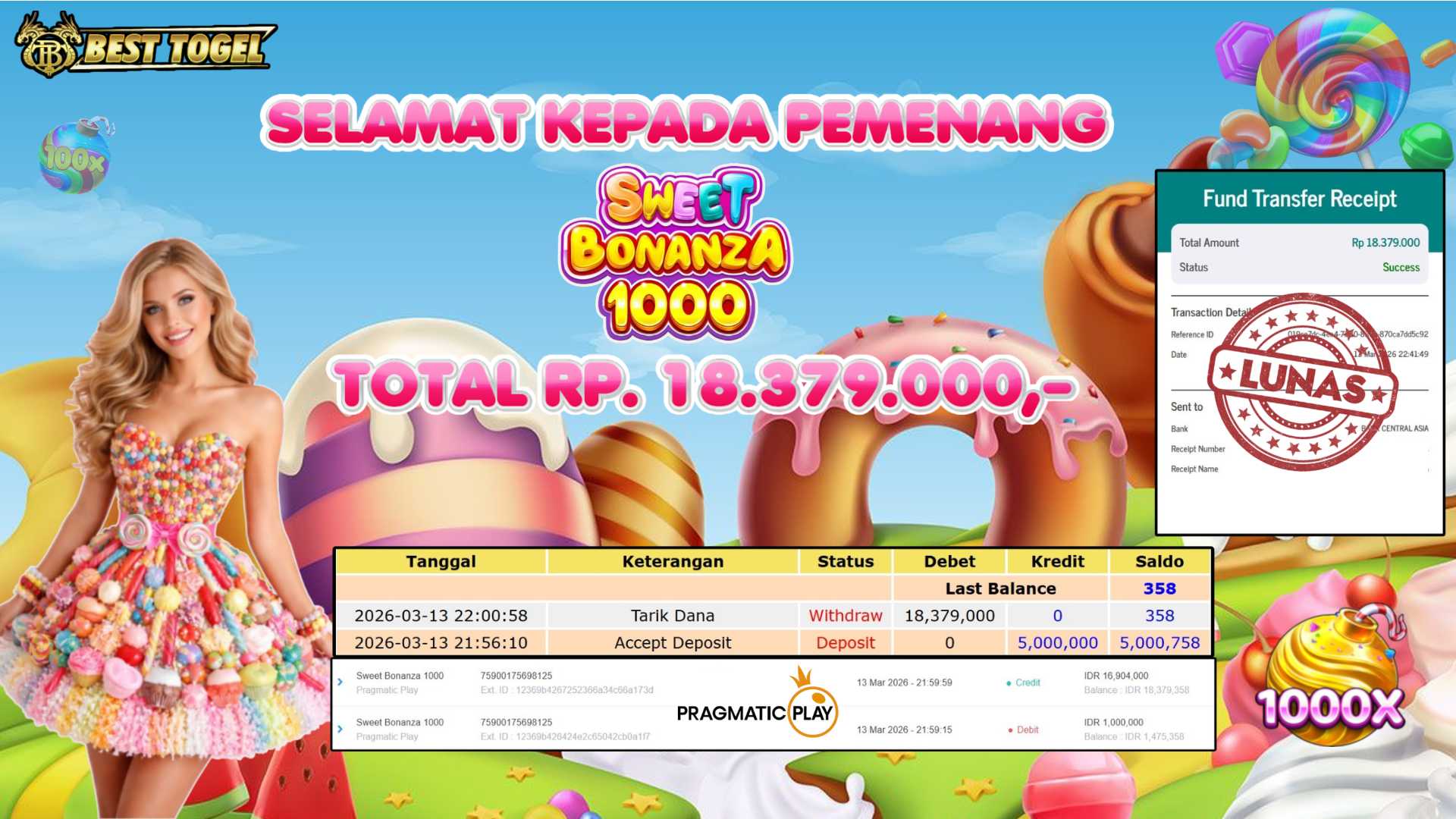 Selamat kepada User id : GMY****** Telah berhasil mendapatkan kemenangan besar pada permainan SLOT SWEET BONANZA 1000 dengan total kemenangan Sebesar Rp. 18.379.000,– Setelah mengisi formulir withdraw dengan kurung waktu hanya 5 – 10 menit pihak BESTTOGEL sudah melakukan transfer kepada pemilik Userid dan dana sudah dapat di cairkan oleh pemenang. Bukti pembayaran yang kami berikan merupakan bukti pembayaran yang SAH / VALID yang langung di dapatkan melaui tanda transfer transaksi dari Bank yang di tuju.
