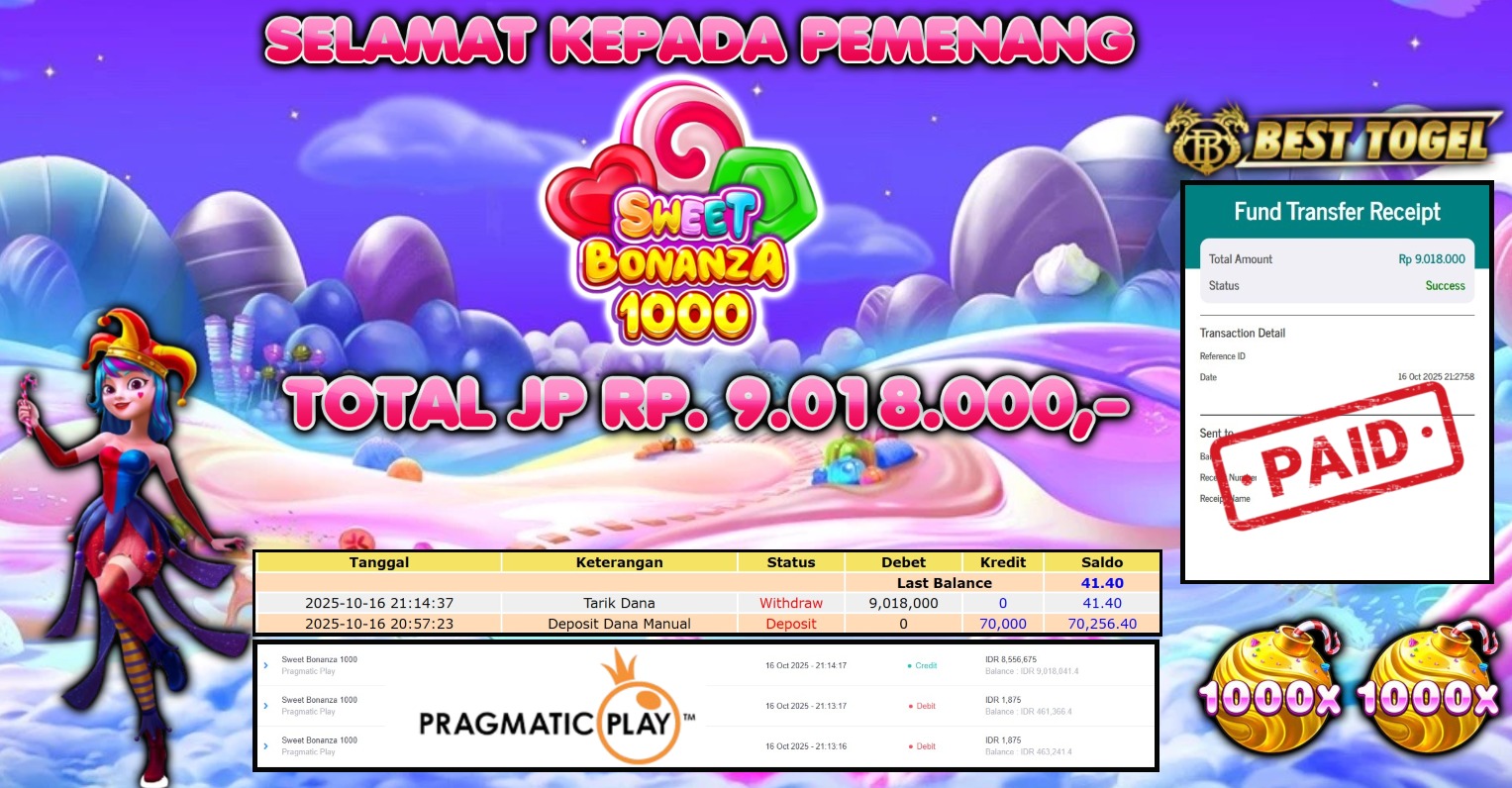 kepada User id : DIM****** Telah berhasil mendapatkan kemenangan besar pada permainan SLOT SWEET BONANZA  1000 dengan total kemenangan Sebesar Rp. 9.018.000,-  Setelah mengisi formulir withdraw dengan kurung waktu hanya 5 – 10 menit pihak BESTTOGEL sudah melakukan transfer kepada pemilik Userid dan dana sudah dapat di cairkan oleh pemenang. Bukti pembayaran yang kami berikan merupakan bukti pembayaran yang SAH / VALID yang langung di dapatkan melaui tanda transfer transaksi dari Bank yang di tuju.