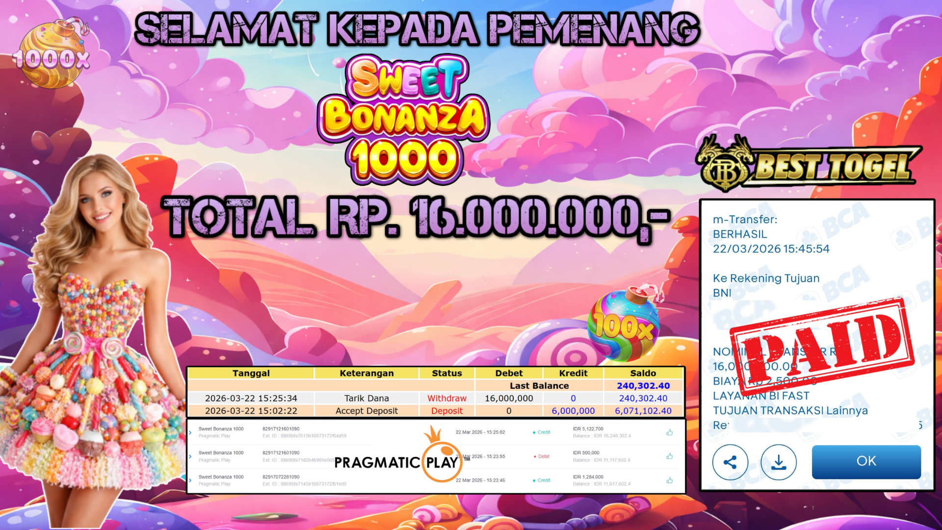 Selamat kepada User id : SM2****** Telah berhasil mendapatkan kemenangan besar pada permainan SLOT SWEET BONANZA 1000 dengan total kemenangan Sebesar Rp.16.000.000,– Setelah mengisi formulir withdraw dengan kurung waktu hanya 5 – 10 menit pihak BESTTOGEL sudah melakukan transfer kepada pemilik Userid dan dana sudah dapat di cairkan oleh pemenang. Bukti pembayaran yang kami berikan merupakan bukti pembayaran yang SAH / VALID yang langung di dapatkan melaui tanda transfer transaksi dari Bank yang di tuju.