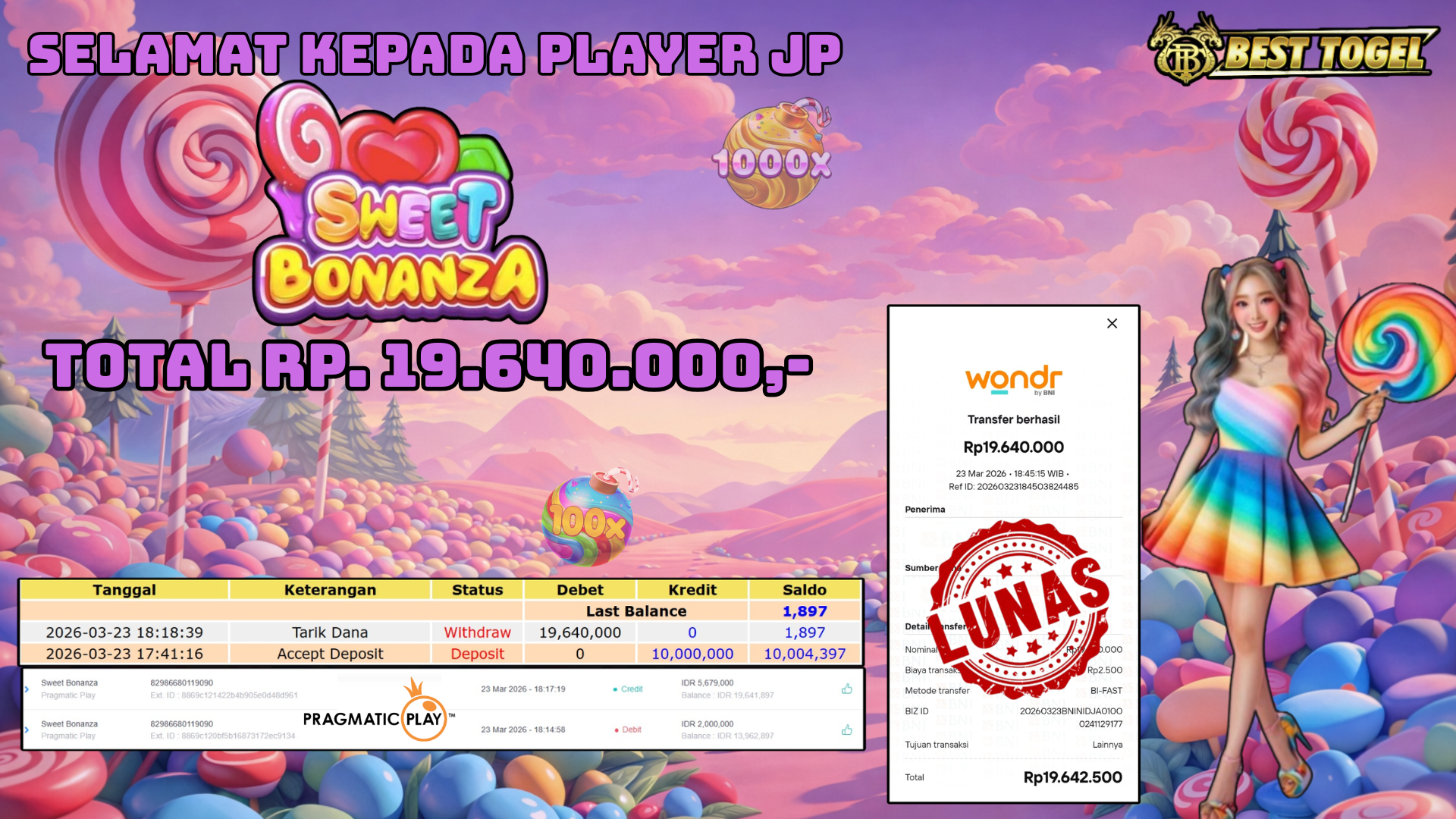 Selamat kepada User id : YDN****** Telah berhasil mendapatkan kemenangan besar pada permainan SLOT SWEET BONANZA dengan total kemenangan Sebesar Rp.19.640.000,– Setelah mengisi formulir withdraw dengan kurung waktu hanya 5 – 10 menit pihak BESTTOGEL sudah melakukan transfer kepada pemilik Userid dan dana sudah dapat di cairkan oleh pemenang. Bukti pembayaran yang kami berikan merupakan bukti pembayaran yang SAH / VALID yang langung di dapatkan melaui tanda transfer transaksi dari Bank yang di tuju.