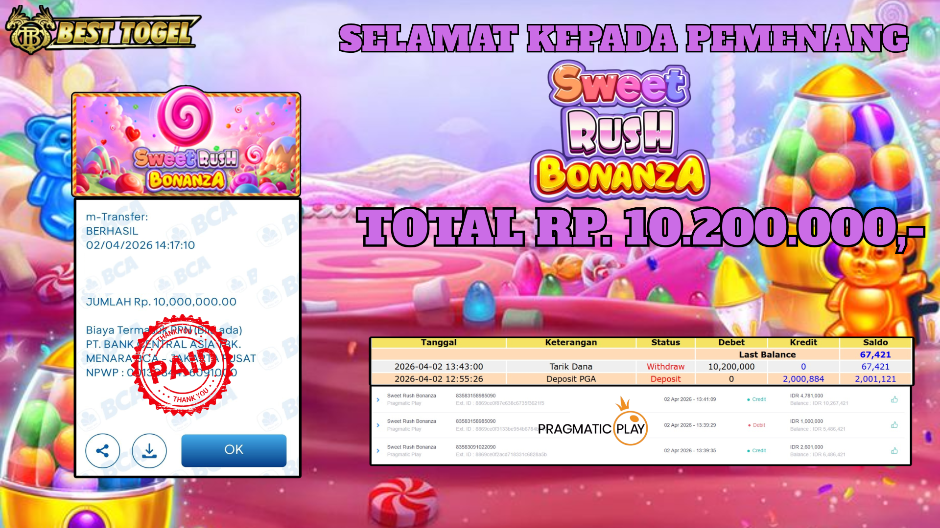 Selamat kepada User id : ESR****** Telah berhasil mendapatkan kemenangan besar pada permainanan SLOT SWEET BONANZA RUSH dengan total kemenangan Sebesar Rp. 10.200.000,– Setelah mengisi formulir withdraw dengan kurung waktu hanya 5 – 10 menit pihak BESTTOGEL sudah melakukan transfer kepada pemilik Userid dan dana sudah dapat di cairkan oleh pemenang. Bukti pembayaran yang kami berikan merupakan bukti pembayaran yang SAH / VALID yang langung di dapatkan melaui tanda transfer transaksi dari Bank yang di tuju.Kami mengucapakan banyak Terima Kasih Kepada pemenang karena sudah mempercayakan kami sebagai Bandar Tepercaya yang membayar semua kemenangan member