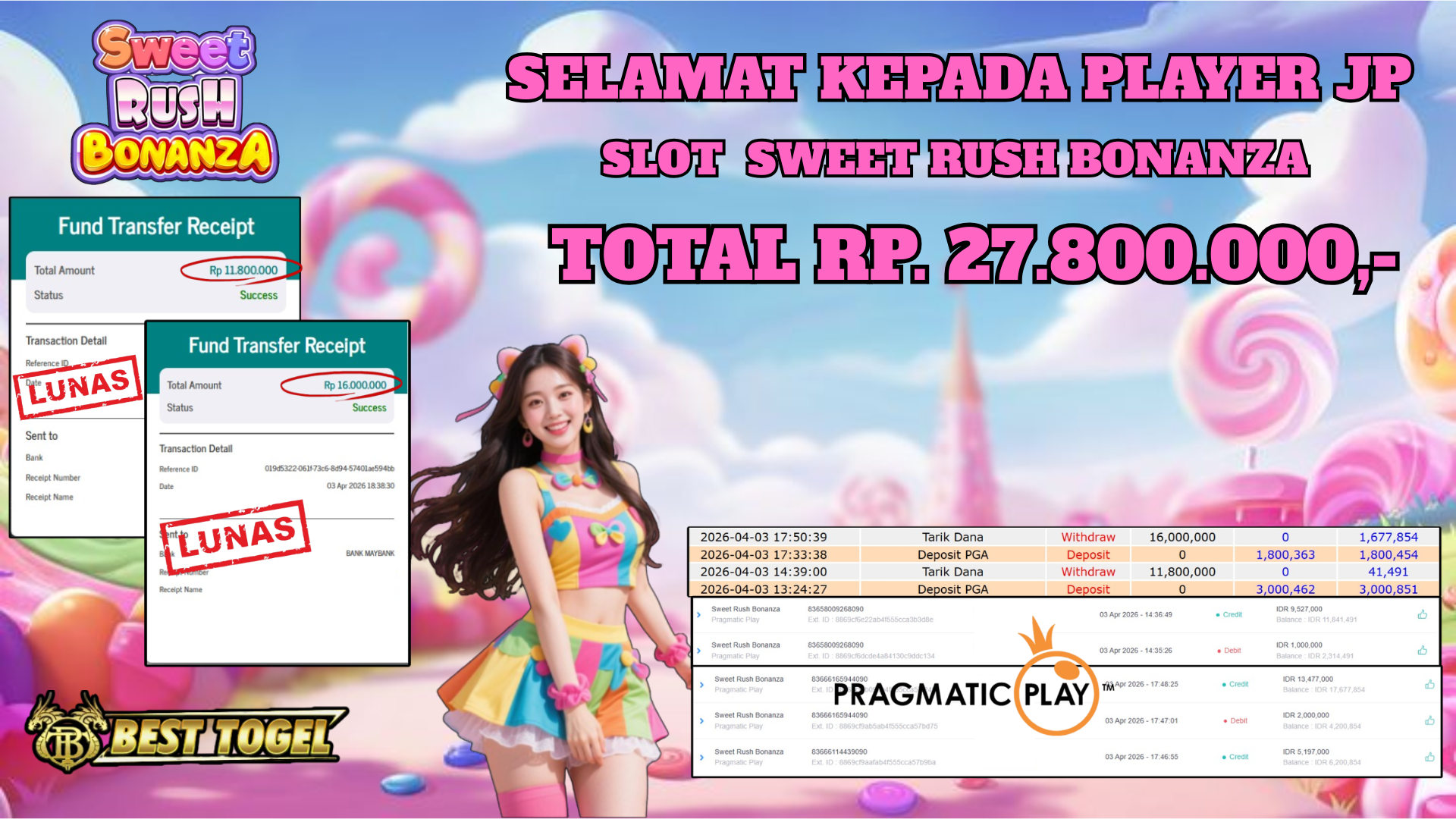 Selamat kepada User id : ESR****** Telah berhasil mendapatkan kemenangan besar pada permainanan  SLOT SWEET BONANZA RUSH  dengan total kemenangan Sebesar Rp. 27.800.000,– Setelah mengisi formulir withdraw dengan kurung waktu hanya 5 – 10 menit pihak  BESTTOGEL sudah melakukan transfer kepada pemilik Userid dan dana sudah dapat di cairkan oleh pemenang. Bukti pembayaran yang kami berikan merupakan bukti pembayaran yang SAH / VALID yang langung di dapatkan melaui tanda transfer transaksi dari Bank yang di tuju.Kami mengucapakan banyak Terima Kasih Kepada pemenang karena sudah mempercayakan kami sebagai Bandar Tepercaya yang membayar semua kemenangan member
