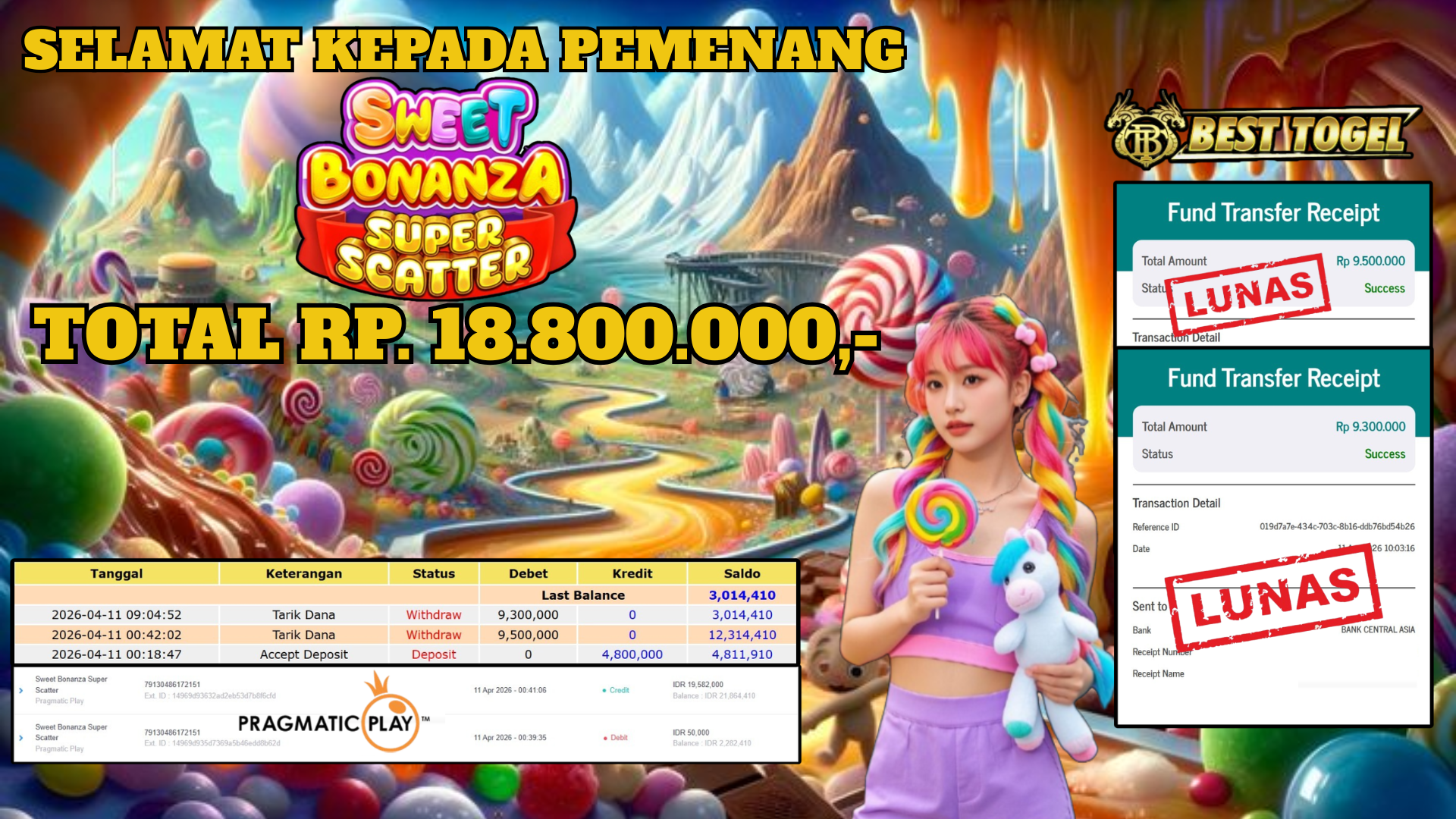 Selamat kepada User id : AAN*** Telah berhasil mendapatkan kemenangan besar pada permainanan SLOT SWEET BONANZA SUPER SCATTER dengan total kemenangan Sebesar Rp. 18.800.000,– Setelah mengisi formulir withdraw dengan kurung waktu hanya 5 – 10 menit pihak BESTTOGEL sudah melakukan transfer kepada pemilik Userid dan dana sudah dapat di cairkan oleh pemenang. Bukti pembayaran yang kami berikan merupakan bukti pembayaran yang SAH / VALID yang langung di dapatkan melaui tanda transfer transaksi dari Bank yang di tuju.Kami mengucapakan banyak Terima Kasih Kepada pemenang karena sudah mempercayakan kami sebagai Bandar Tepercaya yang membayar semua kemenangan member