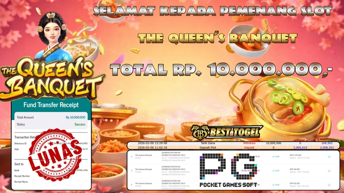 Selamat kepada User id : KSA****** Telah berhasil mendapatkan kemenangan besar pada permainan SLOT THE QUEEN’S BANQUET dengan total kemenangan Sebesar Rp. 10.000.000,– Setelah mengisi formulir withdraw dengan kurung waktu hanya 5 – 10 menit pihak BESTTOGEL sudah melakukan transfer kepada pemilik Userid dan dana sudah dapat di cairkan oleh pemenang. Bukti pembayaran yang kami berikan merupakan bukti pembayaran yang SAH / VALID yang langung di dapatkan melaui tanda transfer transaksi dari Bank yang di tuju.
