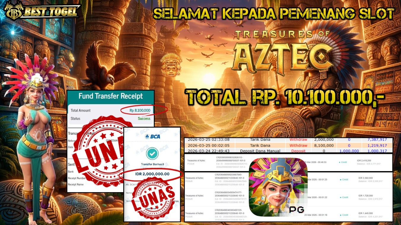 Selamat kepada User id : JPD****** Telah berhasil mendapatkan kemenangan besar pada permainan SLOT TREASURES OF AZTEC dengan total kemenangan Sebesar Rp.10.100.000,– Setelah mengisi formulir withdraw dengan kurung waktu hanya 5 – 10 menit pihak BESTTOGEL sudah melakukan transfer kepada pemilik Userid dan dana sudah dapat di cairkan oleh pemenang. Bukti pembayaran yang kami berikan merupakan bukti pembayaran yang SAH / VALID yang langung di dapatkan melaui tanda transfer transaksi dari Bank yang di tuju.