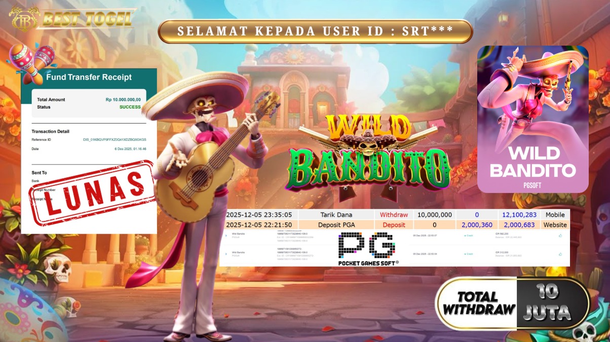 Selamat kepada User id : SRT****** Telah berhasil mendapatkan kemenangan besar pada permainan SLOT WILD BANDITO dengan total kemenangan Sebesar Rp. 10.000.000 ,- Setelah mengisi formulir withdraw dengan kurung waktu hanya 5 – 10 menit pihak BESTTOGEL sudah melakukan transfer kepada pemilik Userid dan dana sudah dapat di cairkan oleh pemenang. Bukti pembayaran yang kami berikan merupakan bukti pembayaran yang SAH / VALID yang langung di dapatkan melaui tanda transfer transaksi dari Bank yang di tuju.