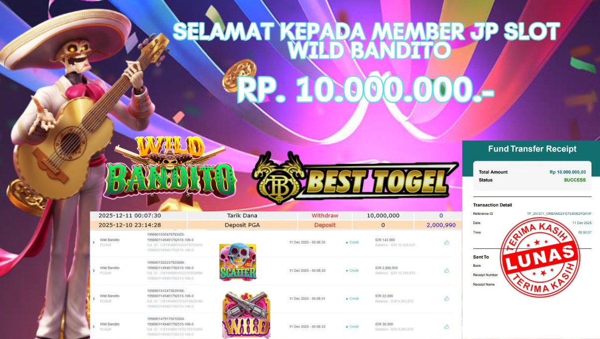 Selamat kepada User id : KEB****** Telah berhasil mendapatkan kemenangan besar pada permainan SLOT WILD BANDITO dengan total kemenangan Sebesar Rp. 10.000.000 ,- Setelah mengisi formulir withdraw dengan kurung waktu hanya 5 – 10 menit pihak BESTTOGEL sudah melakukan transfer kepada pemilik Userid dan dana sudah dapat di cairkan oleh pemenang. Bukti pembayaran yang kami berikan merupakan bukti pembayaran yang SAH / VALID yang langung di dapatkan melaui tanda transfer transaksi dari Bank yang di tuju.