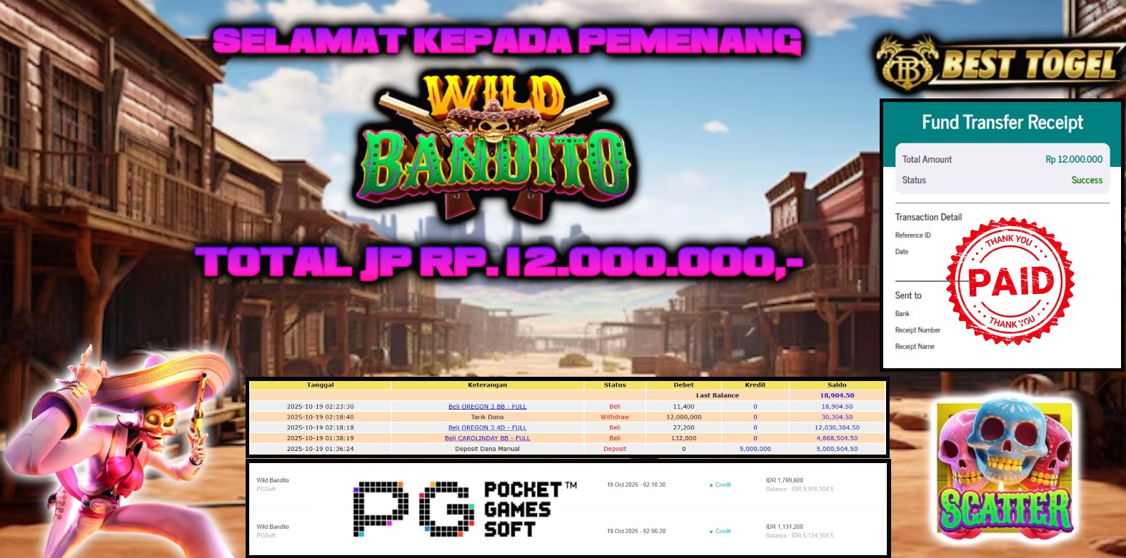 kepada User id : MAR****** Telah berhasil mendapatkan kemenangan besar pada permainan SLOT WILD BANDITO dengan total kemenangan Sebesar Rp. 12.000.000,- Setelah mengisi formulir withdraw dengan kurung waktu hanya 5 – 10 menit pihak BESTTOGEL sudah melakukan transfer kepada pemilik Userid dan dana sudah dapat di cairkan oleh pemenang. Bukti pembayaran yang kami berikan merupakan bukti pembayaran yang SAH / VALID yang langung di dapatkan melaui tanda transfer transaksi dari Bank yang di tuju.