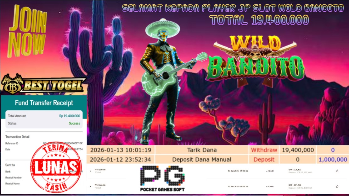 Selamat kepada User id : BES****** Telah berhasil mendapatkan kemenangan besar pada permainan SLOT WILD BANDITO dengan total kemenangan Sebesar Rp.19.400.000,– Setelah mengisi formulir withdraw dengan kurung waktu hanya 5 – 10 menit pihak  BESTTOGEL sudah melakukan transfer kepada pemilik Userid dan dana sudah dapat di cairkan oleh pemenang. Bukti pembayaran yang kami berikan merupakan bukti pembayaran yang SAH / VALID yang langung di dapatkan melaui tanda transfer transaksi dari Bank yang di tuju.