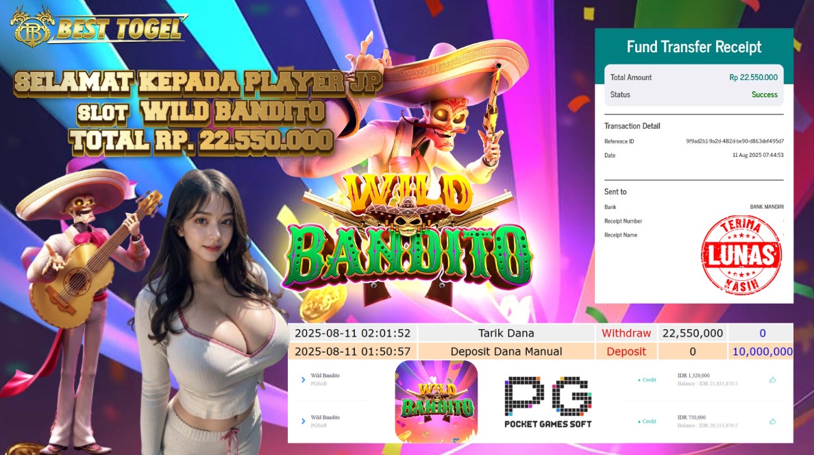 kepada User id : ALG***** Telah berhasil mendapatkan kemenangan besar pada permainan SLOT WILD BANDITO dengan total kemenangan Sebesar Rp. 22.550.000,00- Setelah mengisi formulir withdraw dengan kurung waktu hanya 5 – 10 menit pihak BESTTOGEL sudah melakukan transfer kepada pemilik Userid dan dana sudah dapat di cairkan oleh pemenang. Bukti pembayaran yang kami berikan merupakan bukti pembayaran yang SAH / VALID yang langung di dapatkan melaui tanda transfer transaksi dari Bank yang di tuju.