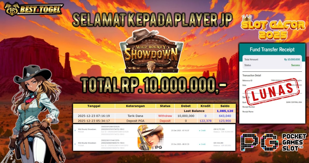 Selamat kepada User id : BEN****** Telah berhasil mendapatkan kemenangan besar pada permainan SLOT WILD BOUNTY SHOWDOWN dengan total kemenangan Sebesar Rp. 10.000.000,- Setelah mengisi formulir withdraw dengan kurung waktu hanya 5 – 10 menit pihak  BESTTOGEL sudah melakukan transfer kepada pemilik Userid dan dana sudah dapat di cairkan oleh pemenang. Bukti pembayaran yang kami berikan merupakan bukti pembayaran yang SAH / VALID yang langung di dapatkan melaui tanda transfer transaksi dari Bank yang di tuju.