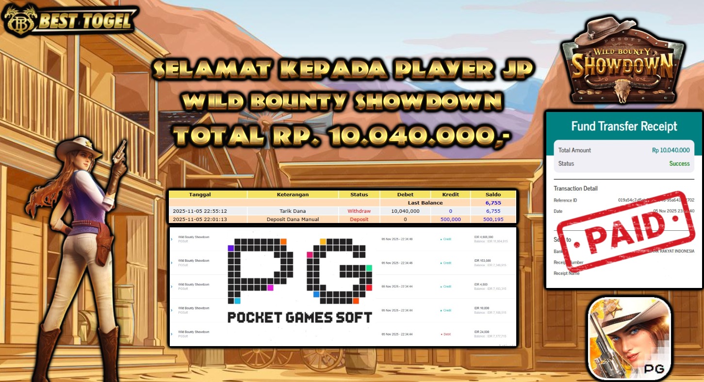 Selamat kepada User id : F2R****** Telah berhasil mendapatkan kemenangan besar pada permainan SLOT WILD BOUNTY SHOWDOWN dengan total kemenangan Sebesar Rp 10.040.000 ,- Setelah mengisi formulir withdraw dengan kurung waktu hanya 5 – 10 menit pihak BESTTOGEL sudah melakukan transfer kepada pemilik Userid dan dana sudah dapat di cairkan oleh pemenang. Bukti pembayaran yang kami berikan merupakan bukti pembayaran yang SAH / VALID yang langung di dapatkan melaui tanda transfer transaksi dari Bank yang di tuju.