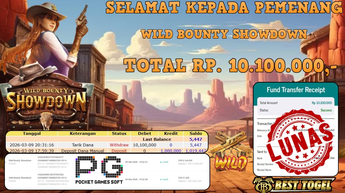 Selamat kepada User id : FIZ****** Telah berhasil mendapatkan kemenangan besar pada permainan  SLOT WILD BOUNTY SHOWDOWN dengan total kemenangan Sebesar Rp. 10.100.000,– Setelah mengisi formulir withdraw dengan kurung waktu hanya 5 – 10 menit pihak  BESTTOGEL sudah melakukan transfer kepada pemilik Userid dan dana sudah dapat di cairkan oleh pemenang. Bukti pembayaran yang kami berikan merupakan bukti pembayaran yang SAH / VALID yang langung di dapatkan melaui tanda transfer transaksi dari Bank yang di tuju.