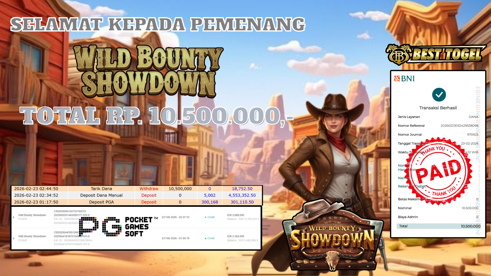 Selamat kepada User id : NCE****** Telah berhasil mendapatkan kemenangan besar pada permainan SLOT WILD BOUNTY SHOWDOWN dengan total kemenangan Sebesar Rp.10.500.000,– Setelah mengisi formulir withdraw dengan kurung waktu hanya 5 – 10 menit pihak BESTTOGEL sudah melakukan transfer kepada pemilik Userid dan dana sudah dapat di cairkan oleh pemenang. Bukti pembayaran yang kami berikan merupakan bukti pembayaran yang SAH / VALID yang langung di dapatkan melaui tanda transfer transaksi dari Bank yang di tuju.