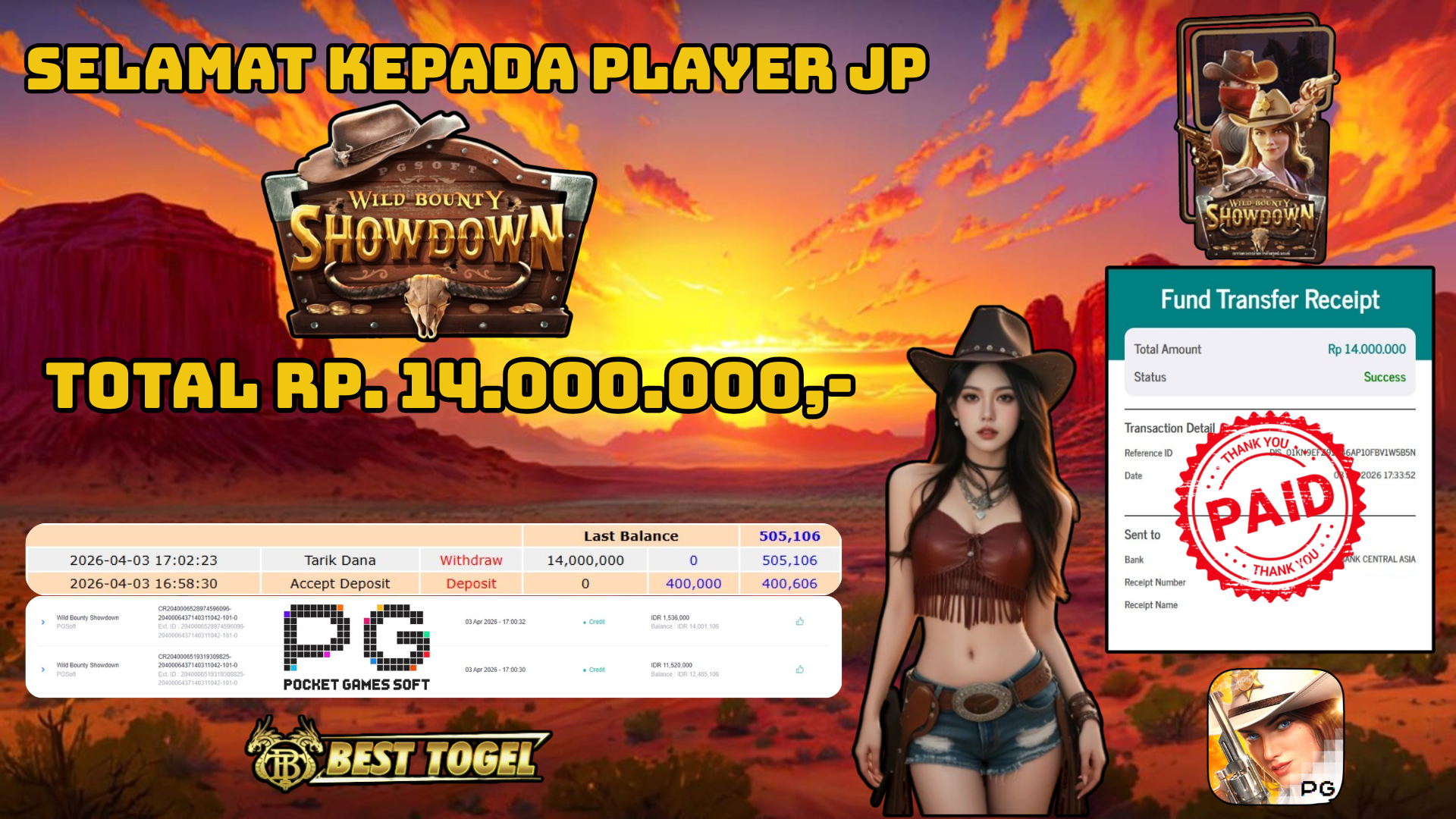 Selamat kepada User id : SIY****** Telah berhasil mendapatkan kemenangan besar pada permainanan SLOT WILD BOUNTY SHOWDOWN dengan total kemenangan Sebesar Rp. 14.000.000,– Setelah mengisi formulir withdraw dengan kurung waktu hanya 5 – 10 menit pihak BESTTOGEL sudah melakukan transfer kepada pemilik Userid dan dana sudah dapat di cairkan oleh pemenang. Bukti pembayaran yang kami berikan merupakan bukti pembayaran yang SAH / VALID yang langung di dapatkan melaui tanda transfer transaksi dari Bank yang di tuju.Kami mengucapakan banyak Terima Kasih Kepada pemenang karena sudah mempercayakan kami sebagai Bandar Tepercaya yang membayar semua kemenangan member