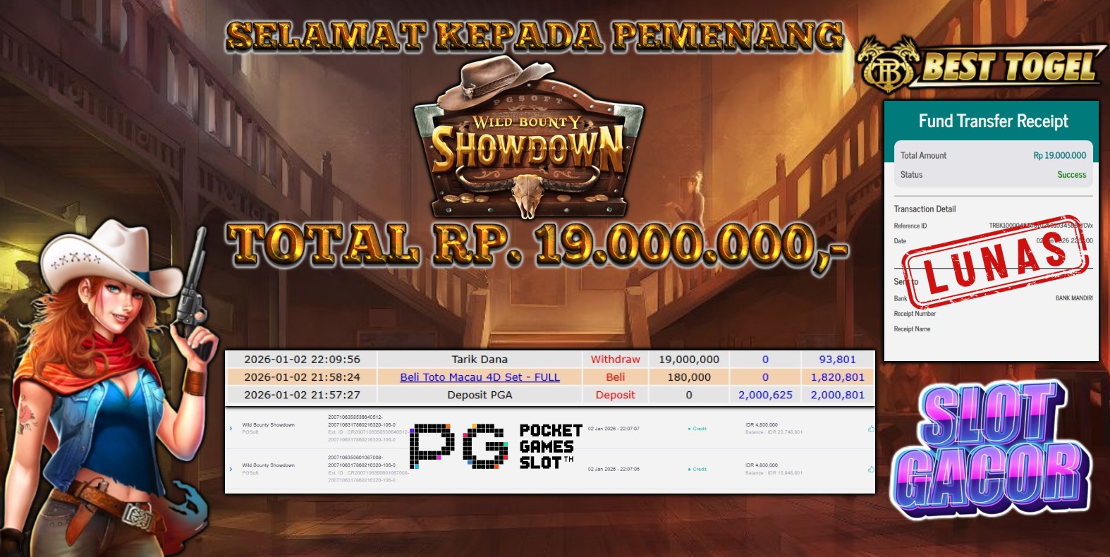 BUKTI JACKPOT SLOT WILD BOUNTY SHOWDOWN RP.19.000.000,- LUNAS