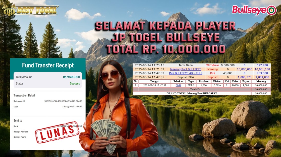kepada User id : HWY***** Telah berhasil mendapatkan kemenangan besar pada permainan TOGEL BULLSEYE dengan total kemenangan Sebesar Rp. 10.000.000,00- Setelah mengisi formulir withdraw dengan kurung waktu hanya 5 – 10 menit pihak BESTTOGEL sudah melakukan transfer kepada pemilik Userid dan dana sudah dapat di cairkan oleh pemenang. Bukti pembayaran yang kami berikan merupakan bukti pembayaran yang SAH / VALID yang langung di dapatkan melaui tanda transfer transaksi dari Bank yang di tuju.