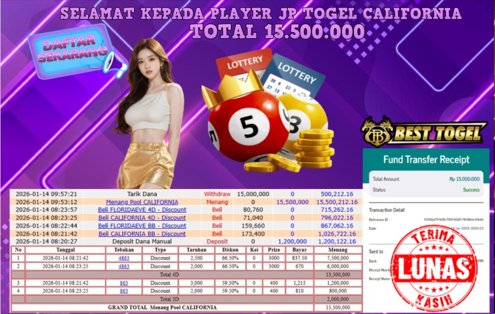 BUKTI JACKPOT TOGEL CALIFORNIA RP.15.500.000,- LUNAS
