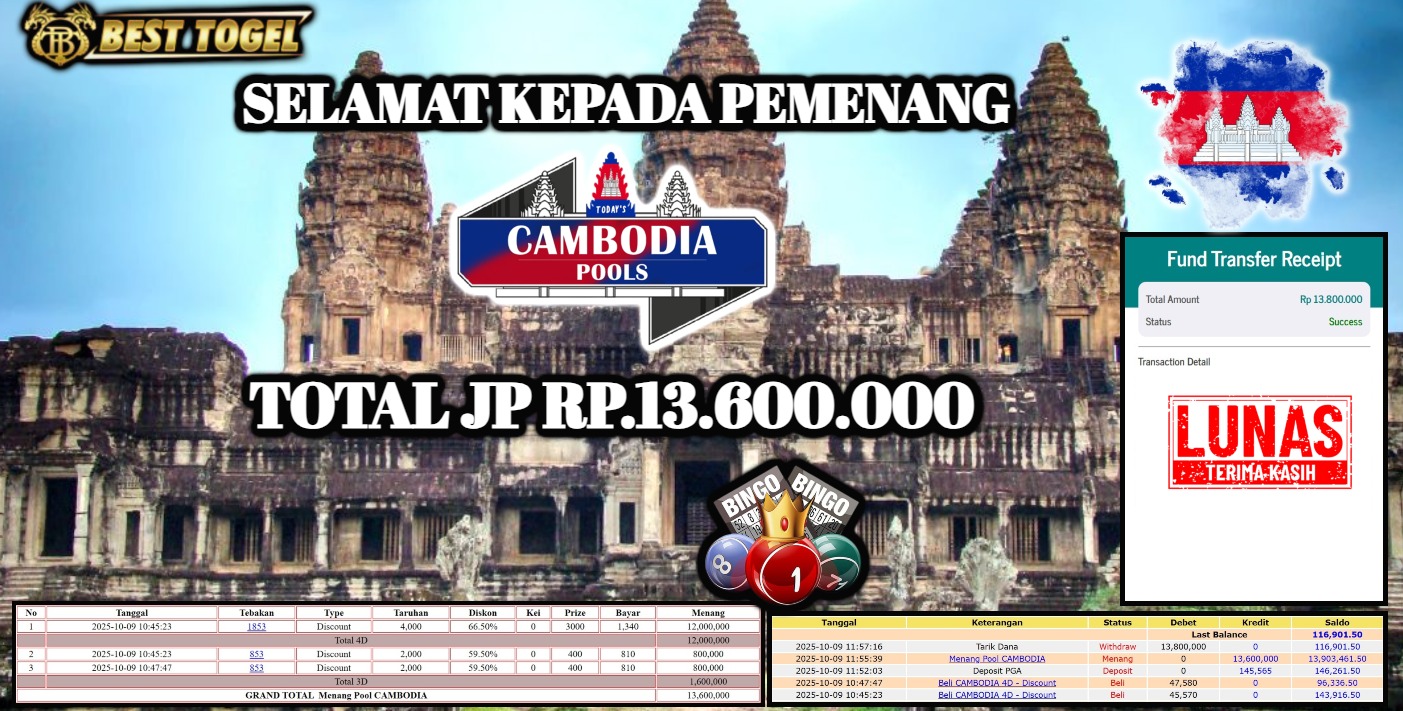 kepada User id : CA****** Telah berhasil mendapatkan kemenangan besar pada permainan TOGEL CAMBODIA POOL dengan total kemenangan Sebesar Rp. 13.600.000,- Setelah mengisi formulir withdraw dengan kurung waktu hanya 5 – 10 menit pihak BESTTOGEL sudah melakukan transfer kepada pemilik Userid dan dana sudah dapat di cairkan oleh pemenang. Bukti pembayaran yang kami berikan merupakan bukti pembayaran yang SAH / VALID yang langung di dapatkan melaui tanda transfer transaksi dari Bank yang di tuju.