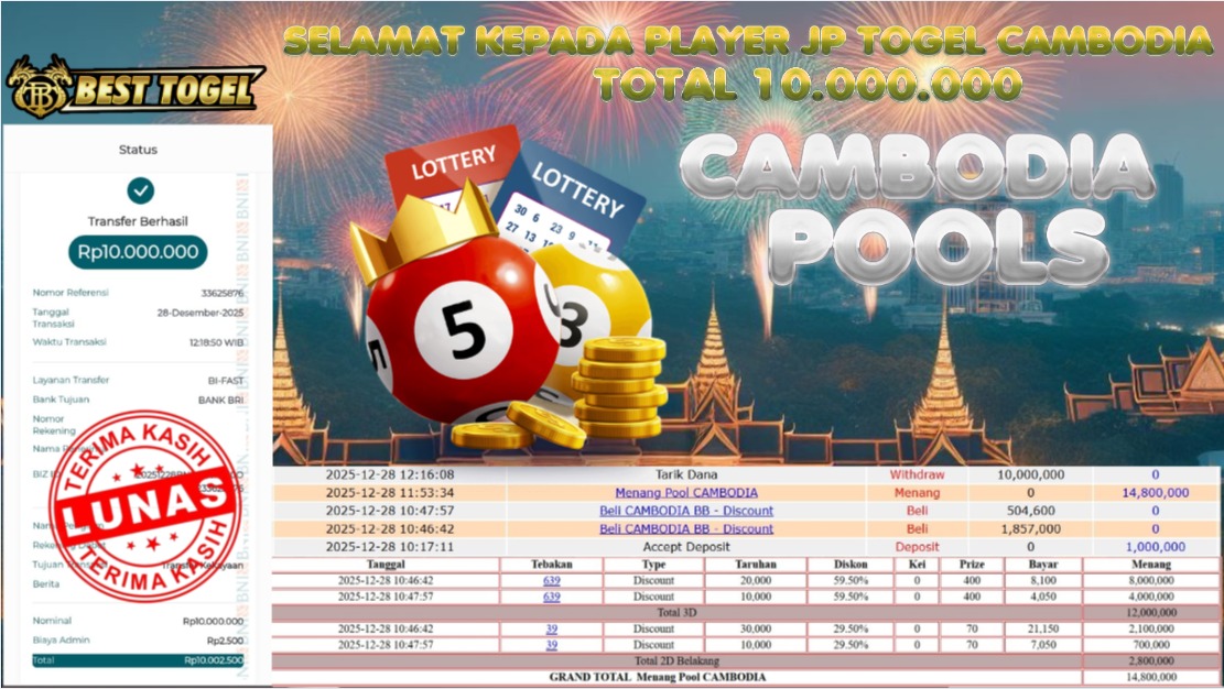 BUKTI JACKPOT TOGEL CAMBODIA POOLS RP.10.000.000,- LUNAS