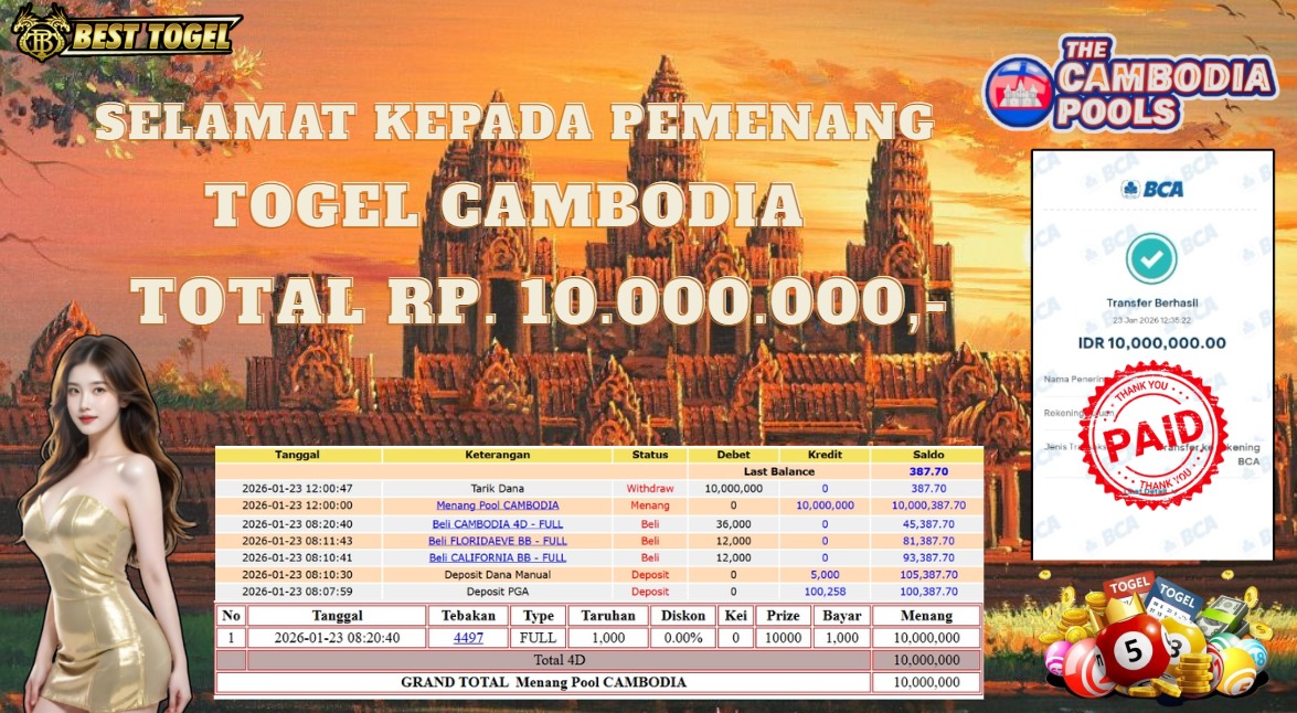 Selamat kepada User id : BOT****** Telah berhasil mendapatkan kemenangan besar pada permainan TOGEL CAMBODIA dengan total kemenangan Sebesar Rp.10.000.000,– Setelah mengisi formulir withdraw dengan kurung waktu hanya 5 – 10 menit pihak BESTTOGEL sudah melakukan transfer kepada pemilik Userid dan dana sudah dapat di cairkan oleh pemenang. Bukti pembayaran yang kami berikan merupakan bukti pembayaran yang SAH / VALID yang langung di dapatkan melaui tanda transfer transaksi dari Bank yang di tuju.