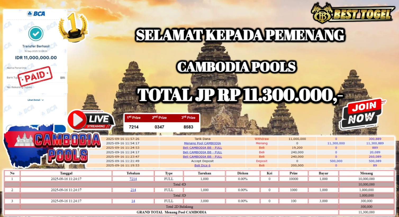 kepada User id : AS***** Telah berhasil mendapatkan kemenangan besar pada permainan TOGEL CAMBODIA dengan total kemenangan Sebesar Rp. 11.300.000,- Setelah mengisi formulir withdraw dengan kurung waktu hanya 5 – 10 menit pihak BESTTOGEL sudah melakukan transfer kepada pemilik Userid dan dana sudah dapat di cairkan oleh pemenang. Bukti pembayaran yang kami berikan merupakan bukti pembayaran yang SAH / VALID yang langung di dapatkan melaui tanda transfer transaksi dari Bank yang di tuju.
