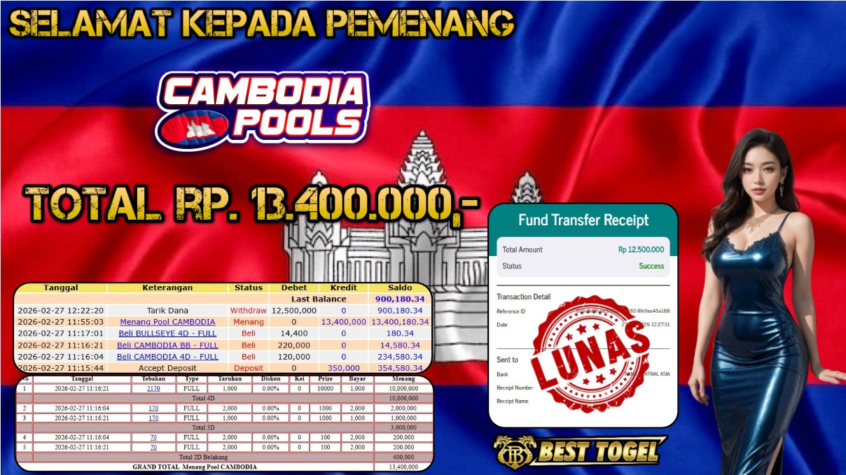 Selamat kepada User id : TRRY****** Telah berhasil mendapatkan kemenangan besar pada permainan TOGEL CAMBODIA dengan total kemenangan Sebesar Rp.13.400.000,– Setelah mengisi formulir withdraw dengan kurung waktu hanya 5 – 10 menit pihak BESTTOGEL sudah melakukan transfer kepada pemilik Userid dan dana sudah dapat di cairkan oleh pemenang. Bukti pembayaran yang kami berikan merupakan bukti pembayaran yang SAH / VALID yang langung di dapatkan melaui tanda transfer transaksi dari Bank yang di tuju.