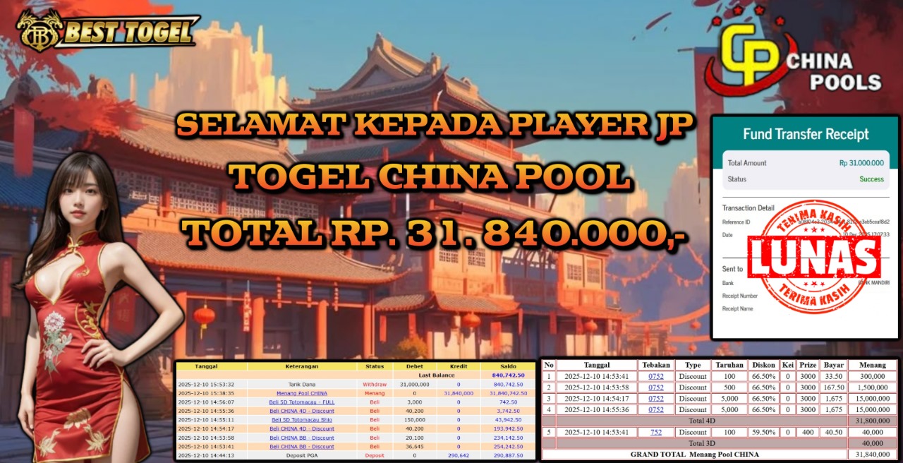 Selamat kepada User id : ROG****** Telah berhasil mendapatkan kemenangan besar pada permainan TOGEL CHINA POOL dengan total kemenangan Sebesar Rp. 31.840.000 ,- Setelah mengisi formulir withdraw dengan kurung waktu hanya 5 – 10 menit pihak BESTTOGEL sudah melakukan transfer kepada pemilik Userid dan dana sudah dapat di cairkan oleh pemenang. Bukti pembayaran yang kami berikan merupakan bukti pembayaran yang SAH / VALID yang langung di dapatkan melaui tanda transfer transaksi dari Bank yang di tuju.