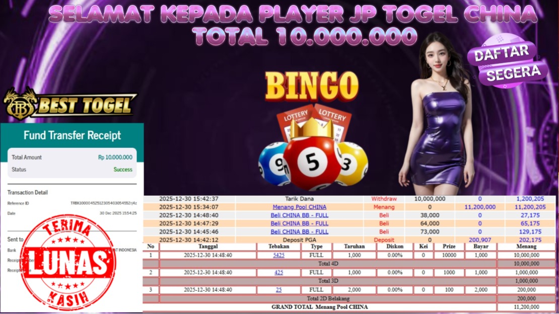 Selamat kepada User id : LNI****** Telah berhasil mendapatkan kemenangan besar pada permainan TOGEL CHINA dengan total kemenangan Sebesar Rp. 10.000.000,- Setelah mengisi formulir withdraw dengan kurung waktu hanya 5 – 10 menit pihak BESTTOGEL sudah melakukan transfer kepada pemilik Userid dan dana sudah dapat di cairkan oleh pemenang. Bukti pembayaran yang kami berikan merupakan bukti pembayaran yang SAH / VALID yang langung di dapatkan melaui tanda transfer transaksi dari Bank yang di tuju.