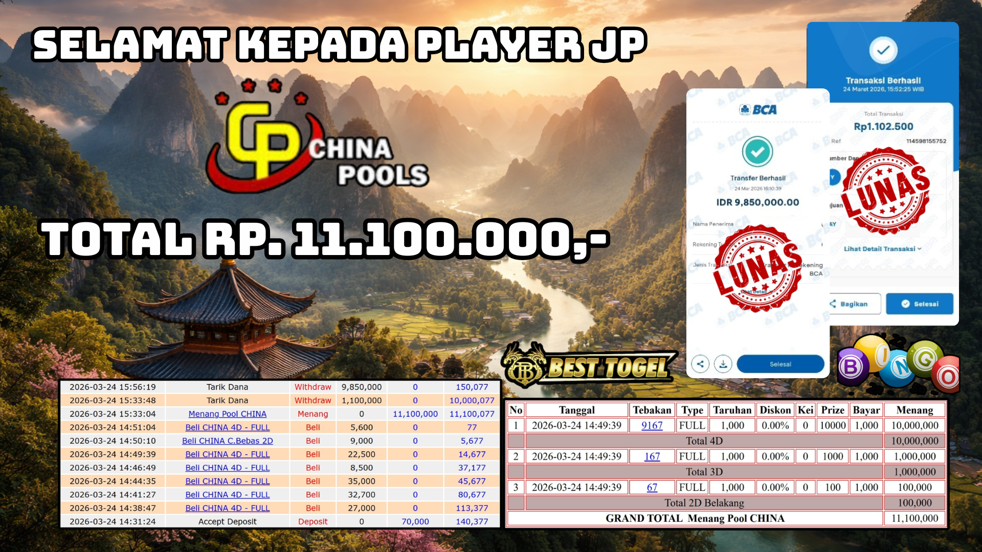 Selamat kepada User id : AGN****** Telah berhasil mendapatkan kemenangan besar pada permainan TOGEL CHINA dengan total kemenangan Sebesar Rp.11.100.000,– Setelah mengisi formulir withdraw dengan kurung waktu hanya 5 – 10 menit pihak BESTTOGEL sudah melakukan transfer kepada pemilik Userid dan dana sudah dapat di cairkan oleh pemenang. Bukti pembayaran yang kami berikan merupakan bukti pembayaran yang SAH / VALID yang langung di dapatkan melaui tanda transfer transaksi dari Bank yang di tuju.