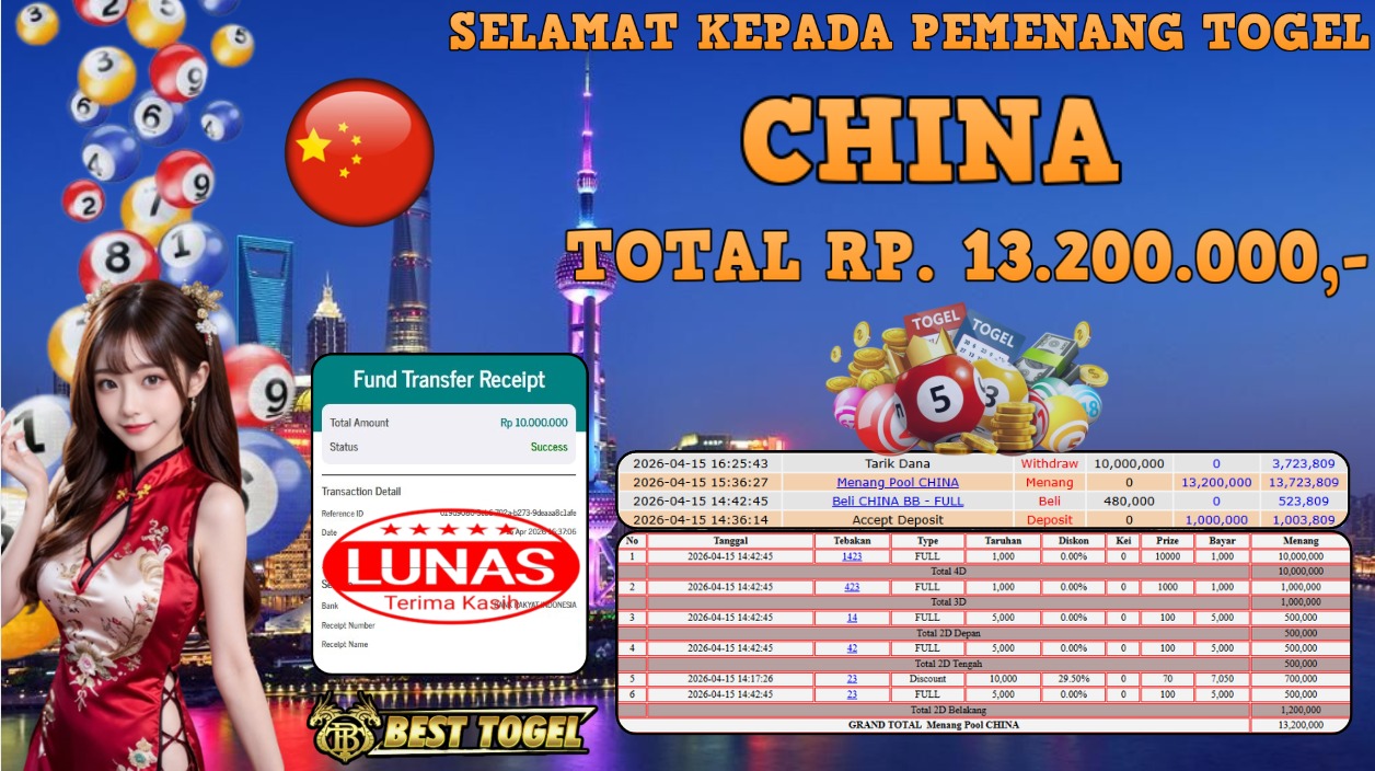 Selamat kepada User id : JHN***41 Telah berhasil mendapatkan kemenangan besar pada permainanan TOGEL CHINA dengan total kemenangan Sebesar Rp. 13.200.000,- Setelah mengisi formulir withdraw dengan kurung waktu hanya 5 – 10 menit pihak BESTTOGEL sudah melakukan transfer kepada pemilik Userid dan dana sudah dapat di cairkan oleh pemenang. Bukti pembayaran yang kami berikan merupakan bukti pembayaran yang SAH / VALID yang langung di dapatkan melaui tanda transfer transaksi dari Bank yang di tuju.Kami mengucapakan banyak Terima Kasih Kepada pemenang karena sudah mempercayakan kami sebagai Bandar Tepercaya yang membayar semua kemenangan member