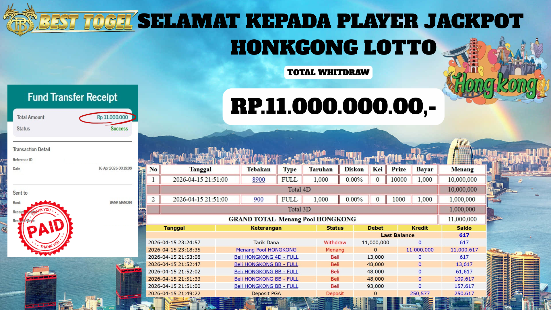 Selamat kepada User id : ARM***41 Telah berhasil mendapatkan kemenangan besar pada permainanan TOGEL HONGKONG LOTTO dengan total kemenangan Sebesar Rp. 11.000.000- Setelah mengisi formulir withdraw dengan kurung waktu hanya 5 – 10 menit pihak BESTTOGEL sudah melakukan transfer kepada pemilik Userid dan dana sudah dapat di cairkan oleh pemenang. Bukti pembayaran yang kami berikan merupakan bukti pembayaran yang SAH / VALID yang langung di dapatkan melaui tanda transfer transaksi dari Bank yang di tuju.Kami mengucapakan banyak Terima Kasih Kepada pemenang karena sudah mempercayakan kami sebagai Bandar Tepercaya yang membayar semua kemenangan member