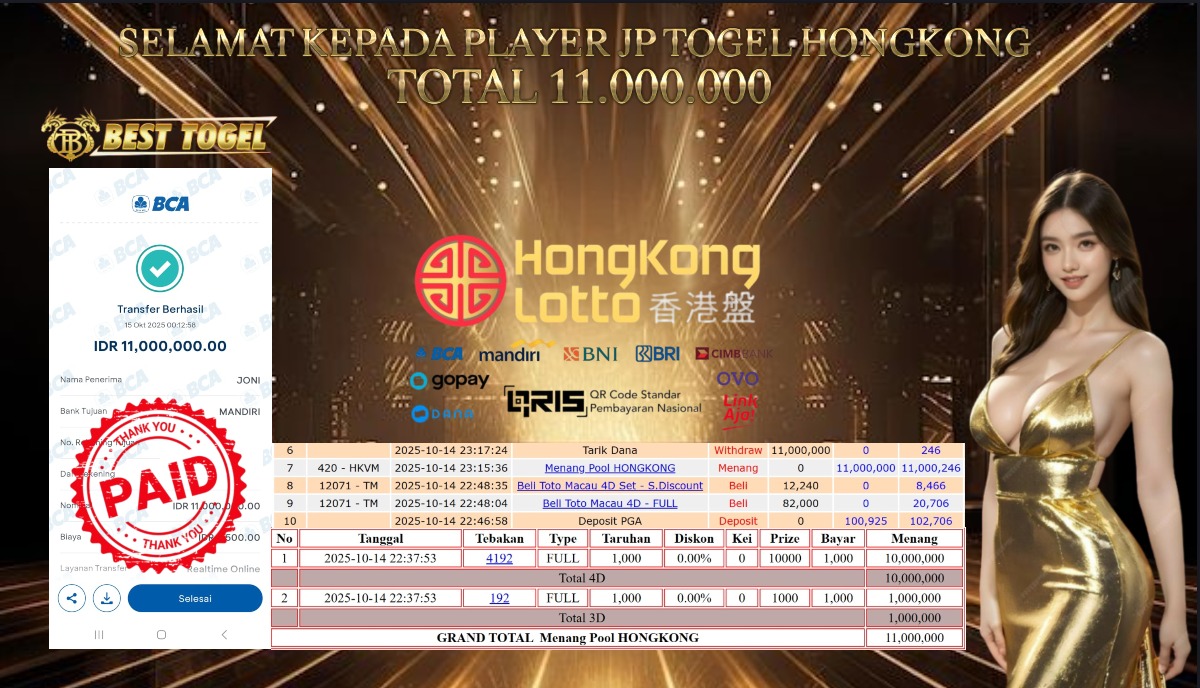 epada User id : SEM****** Telah berhasil mendapatkan kemenangan besar pada permainan TOGEL HONGKONG LOTTO dengan total kemenangan Sebesar Rp. 11.000.000,- Setelah mengisi formulir withdraw dengan kurung waktu hanya 5 – 10 menit pihak BESTTOGEL sudah melakukan transfer kepada pemilik Userid dan dana sudah dapat di cairkan oleh pemenang. Bukti pembayaran yang kami berikan merupakan bukti pembayaran yang SAH / VALID yang langung di dapatkan melaui tanda transfer transaksi dari Bank yang di tuju.