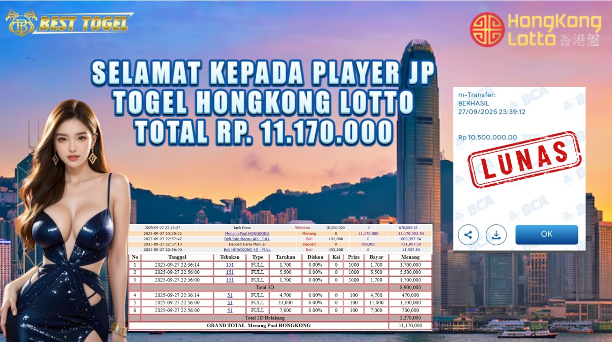 BUKTI JACKPOT TOGEL HONGKONG LOTTO Rp. 11.170.000,- LUNAS
