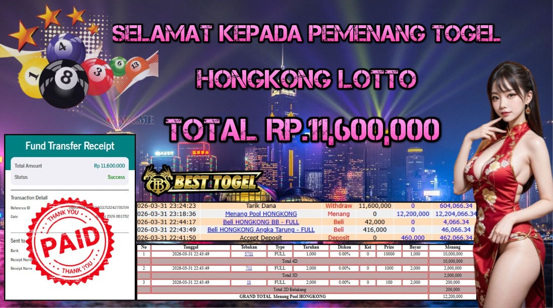 Selamat kepada User id : KAY****** Telah berhasil mendapatkan kemenangan besar pada permainanan TOGEL HONGKONG LOTTO dengan total kemenangan Sebesar Rp.11,600.000,– Setelah mengisi formulir withdraw dengan kurung waktu hanya 5 – 10 menit pihak BESTTOGEL sudah melakukan transfer kepada pemilik Userid dan dana sudah dapat di cairkan oleh pemenang. Bukti pembayaran yang kami berikan merupakan bukti pembayaran yang SAH / VALID yang langung di dapatkan melaui tanda transfer transaksi dari Bank yang di tuju.