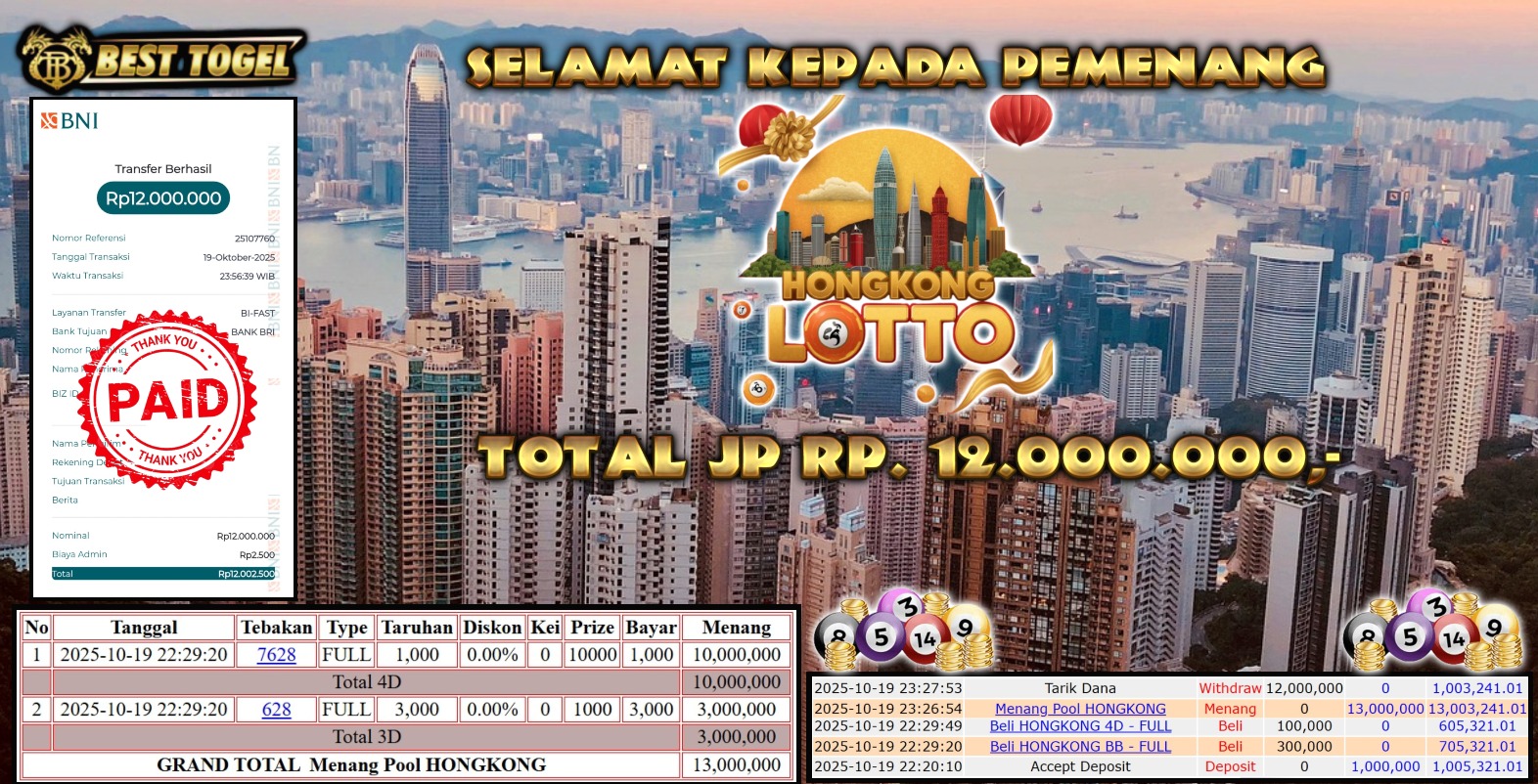 Selamat kepada User id : AND****** Telah berhasil mendapatkan kemenangan besar pada permainan TOGEL HONGKONG LOTTO dengan total kemenangan Sebesar Rp 12.000.000,- Setelah mengisi formulir withdraw dengan kurung waktu hanya 5 – 10 menit pihak BESTTOGEL sudah melakukan transfer kepada pemilik Userid dan dana sudah dapat di cairkan oleh pemenang. Bukti pembayaran yang kami berikan merupakan bukti pembayaran yang SAH / VALID yang langung di dapatkan melaui tanda transfer transaksi dari Bank yang di tuju.
