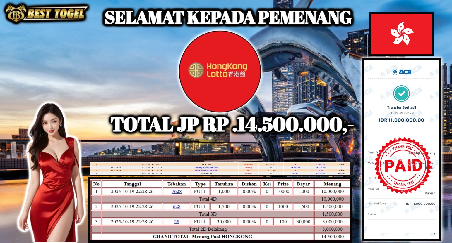 Selamat kepada User id : SAN****** Telah berhasil mendapatkan kemenangan besar pada permainan TOGEL HONGKONG LOTTO dengan total kemenangan Sebesar Rp 14.500.000,- Setelah mengisi formulir withdraw dengan kurung waktu hanya 5 – 10 menit pihak BESTTOGEL sudah melakukan transfer kepada pemilik Userid dan dana sudah dapat di cairkan oleh pemenang. Bukti pembayaran yang kami berikan merupakan bukti pembayaran yang SAH / VALID yang langung di dapatkan melaui tanda transfer transaksi dari Bank yang di tuju.