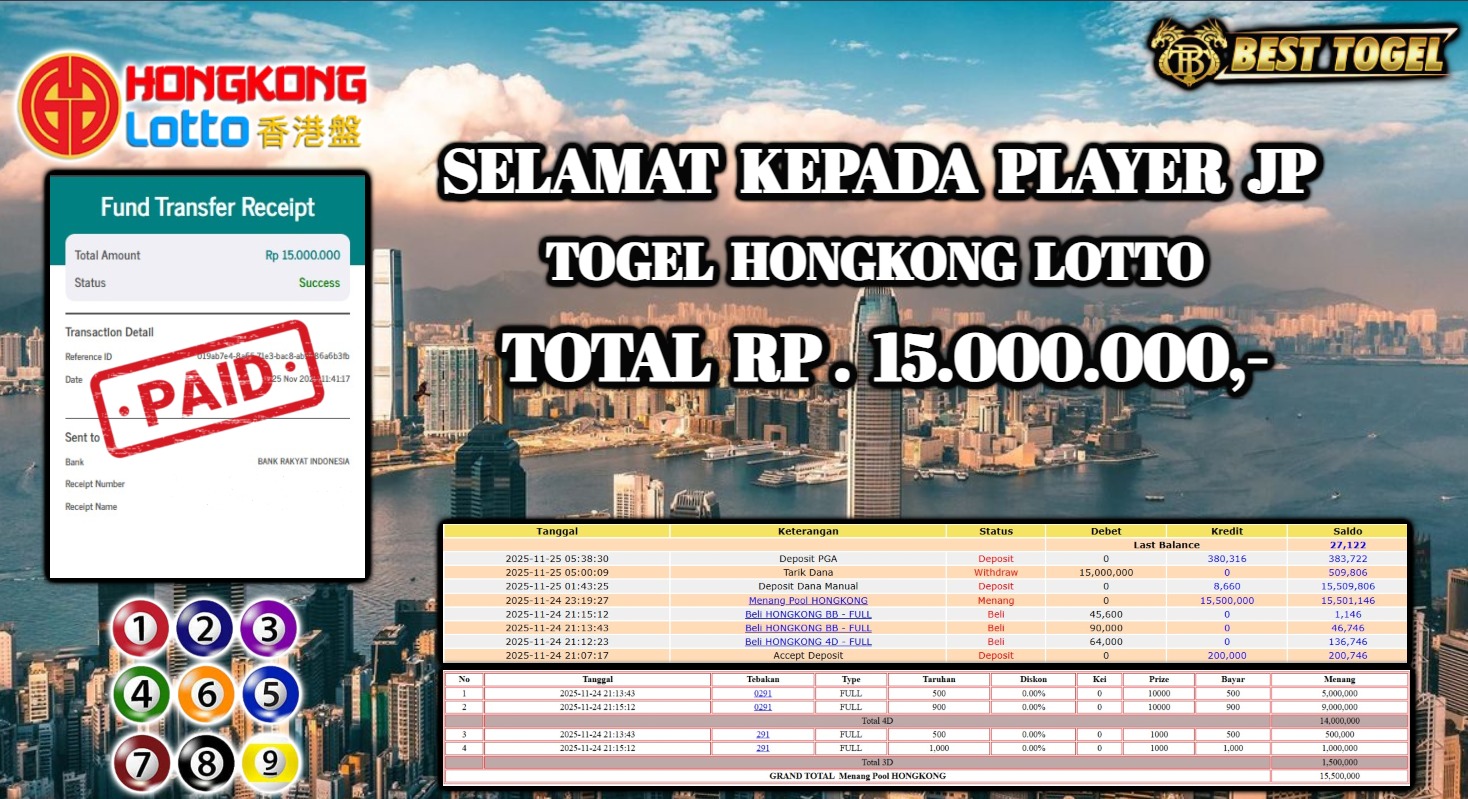 Selamat kepada User id : MD8****** Telah berhasil mendapatkan kemenangan besar pada permainan TOGEL HONGKONG LOTTO dengan total kemenangan Sebesar Rp 15.000.000 ,- Setelah mengisi formulir withdraw dengan kurung waktu hanya 5 – 10 menit pihak BESTTOGEL sudah melakukan transfer kepada pemilik Userid dan dana sudah dapat di cairkan oleh pemenang. Bukti pembayaran yang kami berikan merupakan bukti pembayaran yang SAH / VALID yang langung di dapatkan melaui tanda transfer transaksi dari Bank yang di tuju.