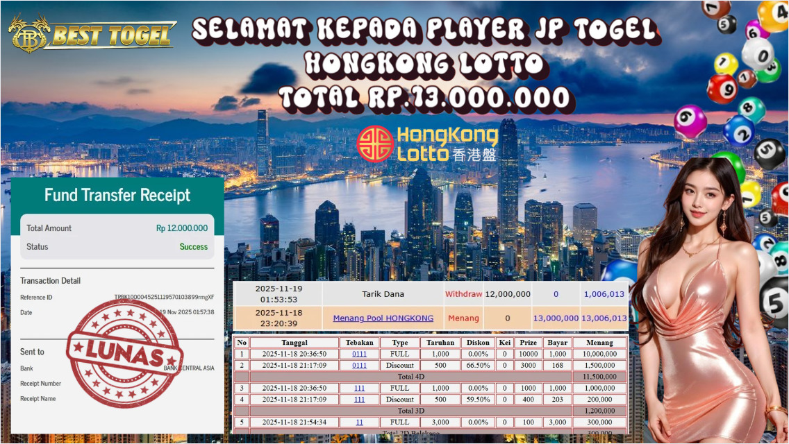 Selamat kepada User id : PAQ****** Telah berhasil mendapatkan kemenangan besar pada permainan TOGEL HONGKONG LOTTO dengan total kemenangan Sebesar Rp 13.000.000 ,- Setelah mengisi formulir withdraw dengan kurung waktu hanya 5 – 10 menit pihak BESTTOGEL sudah melakukan transfer kepada pemilik Userid dan dana sudah dapat di cairkan oleh pemenang. Bukti pembayaran yang kami berikan merupakan bukti pembayaran yang SAH / VALID yang langung di dapatkan melaui tanda transfer transaksi dari Bank yang di tuju.
