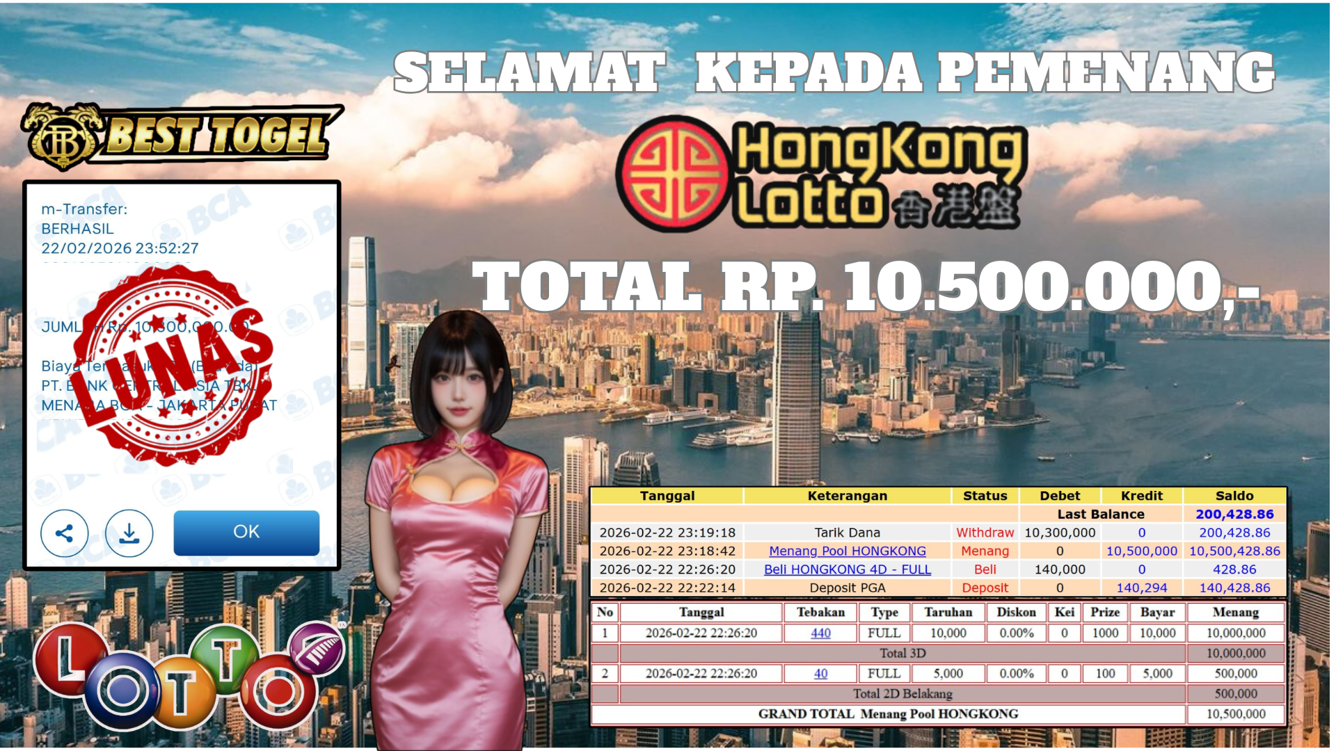 Selamat kepada User id : BES****** Telah berhasil mendapatkan kemenangan besar pada permainan TOGEL HONGKONG dengan total kemenangan Sebesar Rp.10.500.000,– Setelah mengisi formulir withdraw dengan kurung waktu hanya 5 – 10 menit pihak BESTTOGEL sudah melakukan transfer kepada pemilik Userid dan dana sudah dapat di cairkan oleh pemenang. Bukti pembayaran yang kami berikan merupakan bukti pembayaran yang SAH / VALID yang langung di dapatkan melaui tanda transfer transaksi dari Bank yang di tuju.