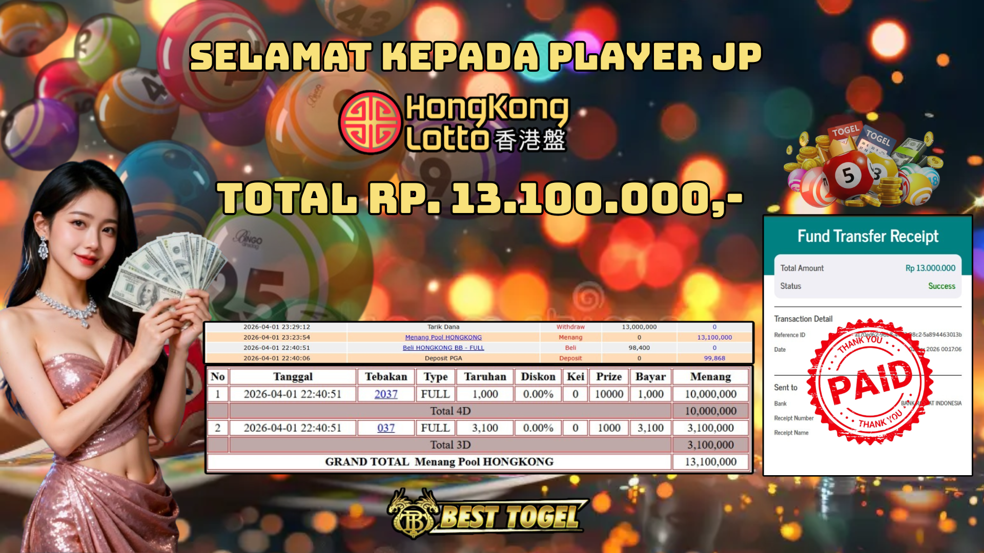 Selamat kepada User id : WAS****** Telah berhasil mendapatkan kemenangan besar pada permainanan TOGEL HONGKONG dengan total kemenangan Sebesar Rp. 13.100.000,– Setelah mengisi formulir withdraw dengan kurung waktu hanya 5 – 10 menit pihak BESTTOGEL sudah melakukan transfer kepada pemilik Userid dan dana sudah dapat di cairkan oleh pemenang. Bukti pembayaran yang kami berikan merupakan bukti pembayaran yang SAH / VALID yang langung di dapatkan melaui tanda transfer transaksi dari Bank yang di tuju.Kami mengucapakan banyak Terima Kasih Kepada pemenang karena sudah mempercayakan kami sebagai Bandar Tepercaya yang membayar semua kemenangan member