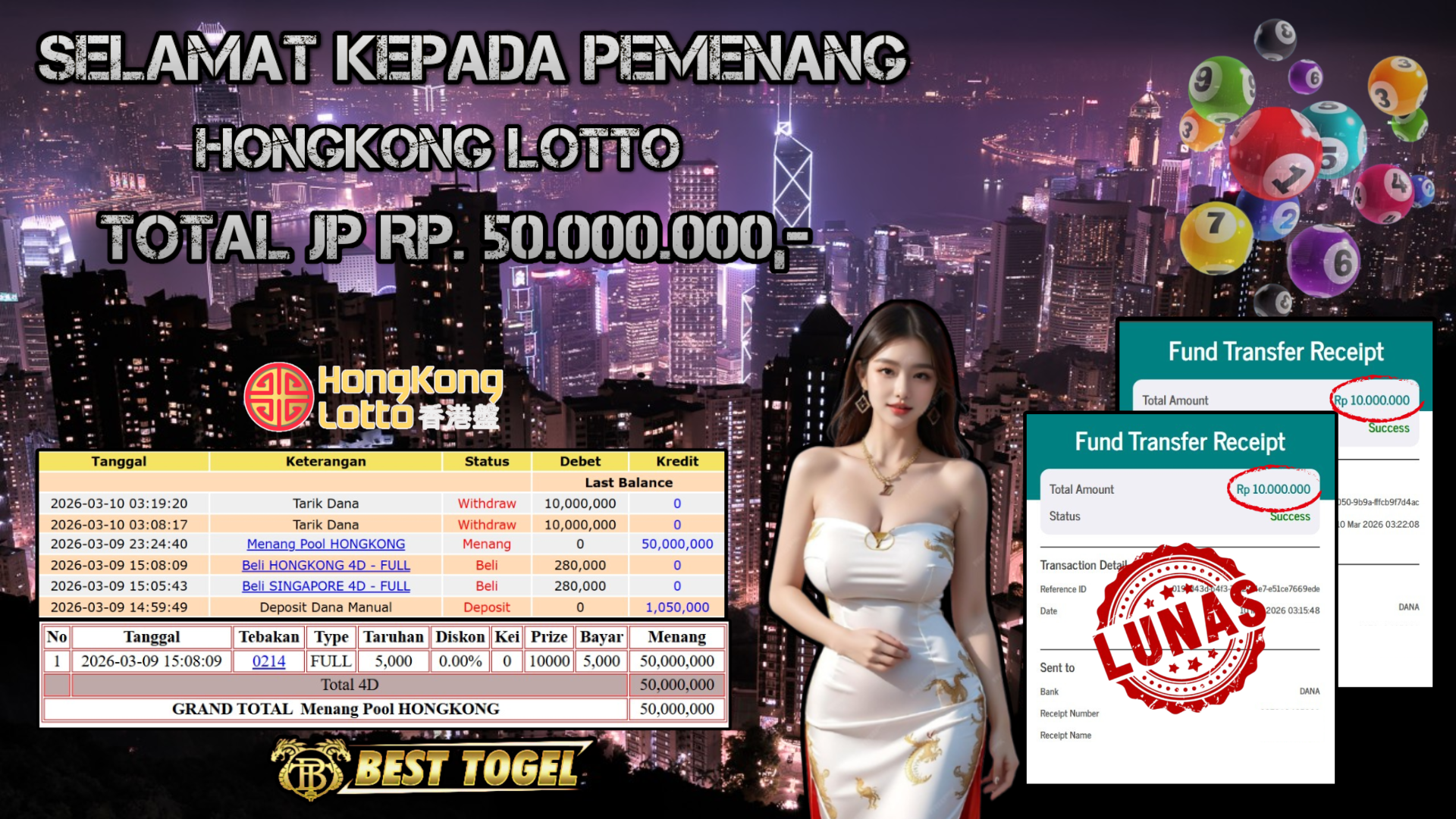 Selamat kepada User id :FRN****** Telah berhasil mendapatkan kemenangan besar pada permainan TOGEL HONGKONG dengan total kemenangan Sebesar Rp. 50.00.000,– Setelah mengisi formulir withdraw dengan kurung waktu hanya 5 – 10 menit pihak BESTTOGEL sudah melakukan transfer kepada pemilik Userid dan dana sudah dapat di cairkan oleh pemenang. Bukti pembayaran yang kami berikan merupakan bukti pembayaran yang SAH / VALID yang langung di dapatkan melaui tanda transfer transaksi dari Bank yang di tuju.